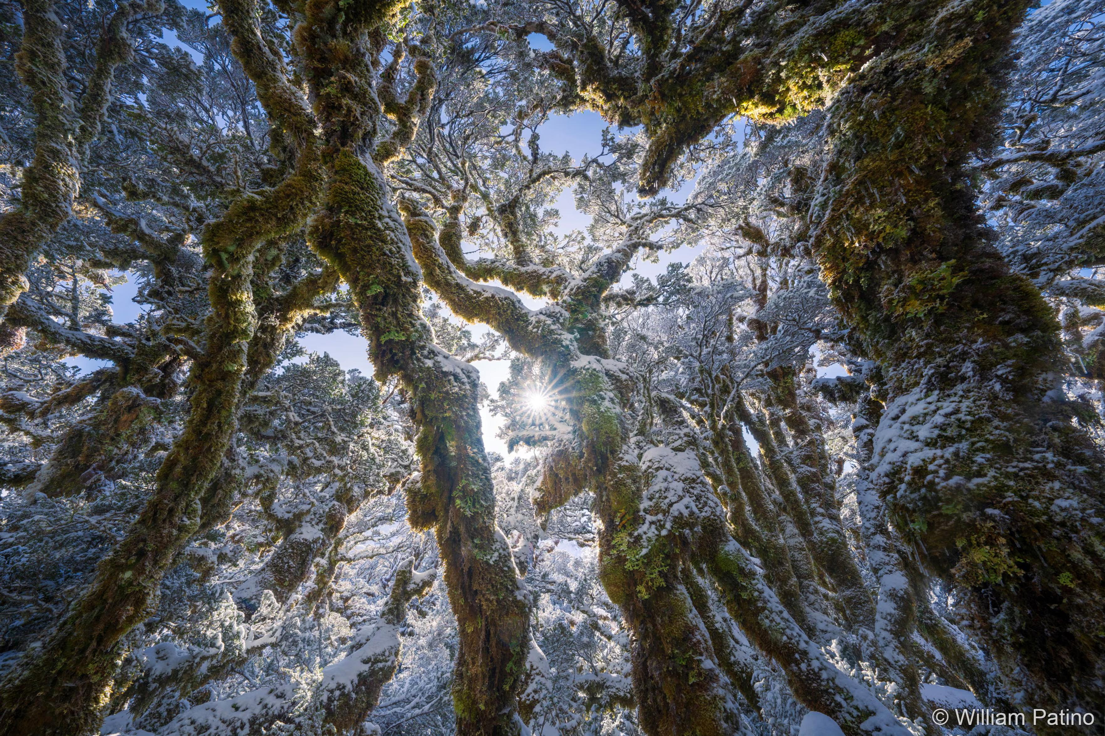 ‘On a camping trip with my son, we came across this amazing section of silver beech that were stunted and beautifully sculpted by the elements. After several attempts, I was finally present when it snowed. Not long after dawn, the clouds departed, and the low angled sun added a hint of warmth to the fairytale scene.’ Te Rua-o-te-Moko/Fiordland, New Zealand.