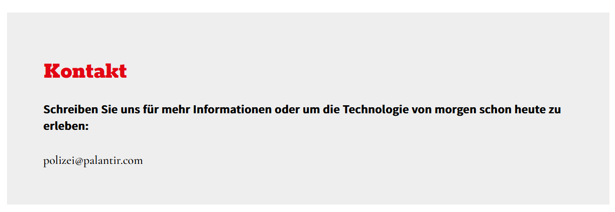 Die Gewerkschaft der Polizei hat auf ihrer Webseite einen langen Artikel, warum sie unbedingt "Vera" (also #Palantir ) braucht. Am Ende der Seite steht dann, für Rückfragen solle man sich bei polizei@palantir.com melden. Damit ist wohl klar, wessen PR-Abteilung den Text geschrieben hat...