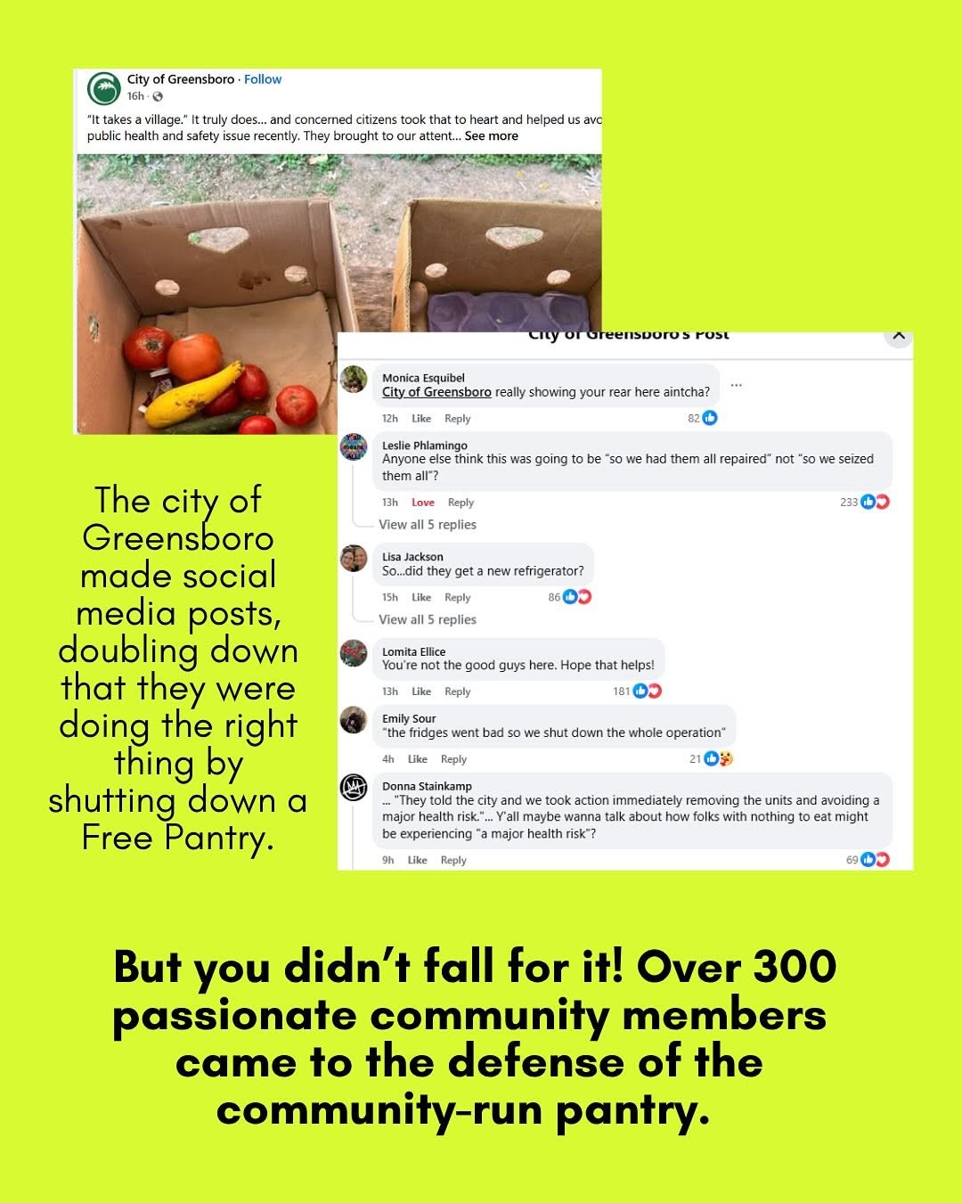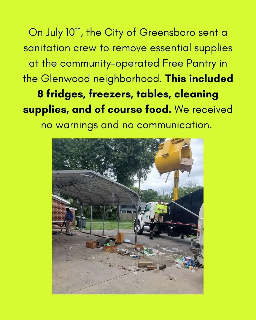 on july 10th, "greensboro" food not bombs had their 8 fridges, freezers, tables, cleaning supplies, & food destroyed by the city with no warning.