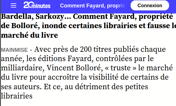 Bardella, Sarkozy… Comment Fayard, propriété de Bolloré, inonde certaines librairies et fausse le marché du livre mainmise•Avec près de 200 titres publiés chaque année, les éditions Fayard, contrôlées par le milliardaire, Vincent Bolloré, « truste » le marché du livre pour accroître la visibilité de certains de ses auteurs. Et ce, au détriment des petites librairies