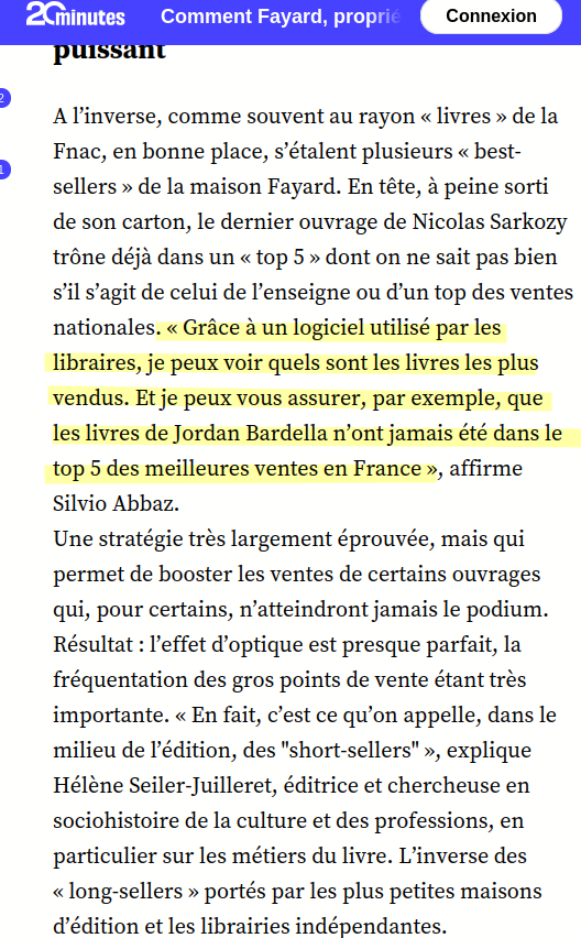A l’inverse, comme souvent au rayon « livres » de la Fnac, en bonne place, s’étalent plusieurs « best-sellers » de la maison Fayard. En tête, à peine sorti de son carton, le dernier ouvrage de Nicolas Sarkozy trône déjà dans un « top 5 » dont on ne sait pas bien s’il s’agit de celui de l’enseigne ou d’un top des ventes nationales. « Grâce à un logiciel utilisé par les libraires, je peux voir quels sont les livres les plus vendus. Et je peux vous assurer, par exemple, que les livres de Jordan Bardella n’ont jamais été dans le top 5 des meilleures ventes en France », affirme Silvio Abbaz. Une stratégie très largement éprouvée, mais qui permet de booster les ventes de certains ouvrages qui, pour certains, n’atteindront jamais le podium. Résultat : l’effet d’optique est presque parfait, la fréquentation des gros points de vente étant très importante.