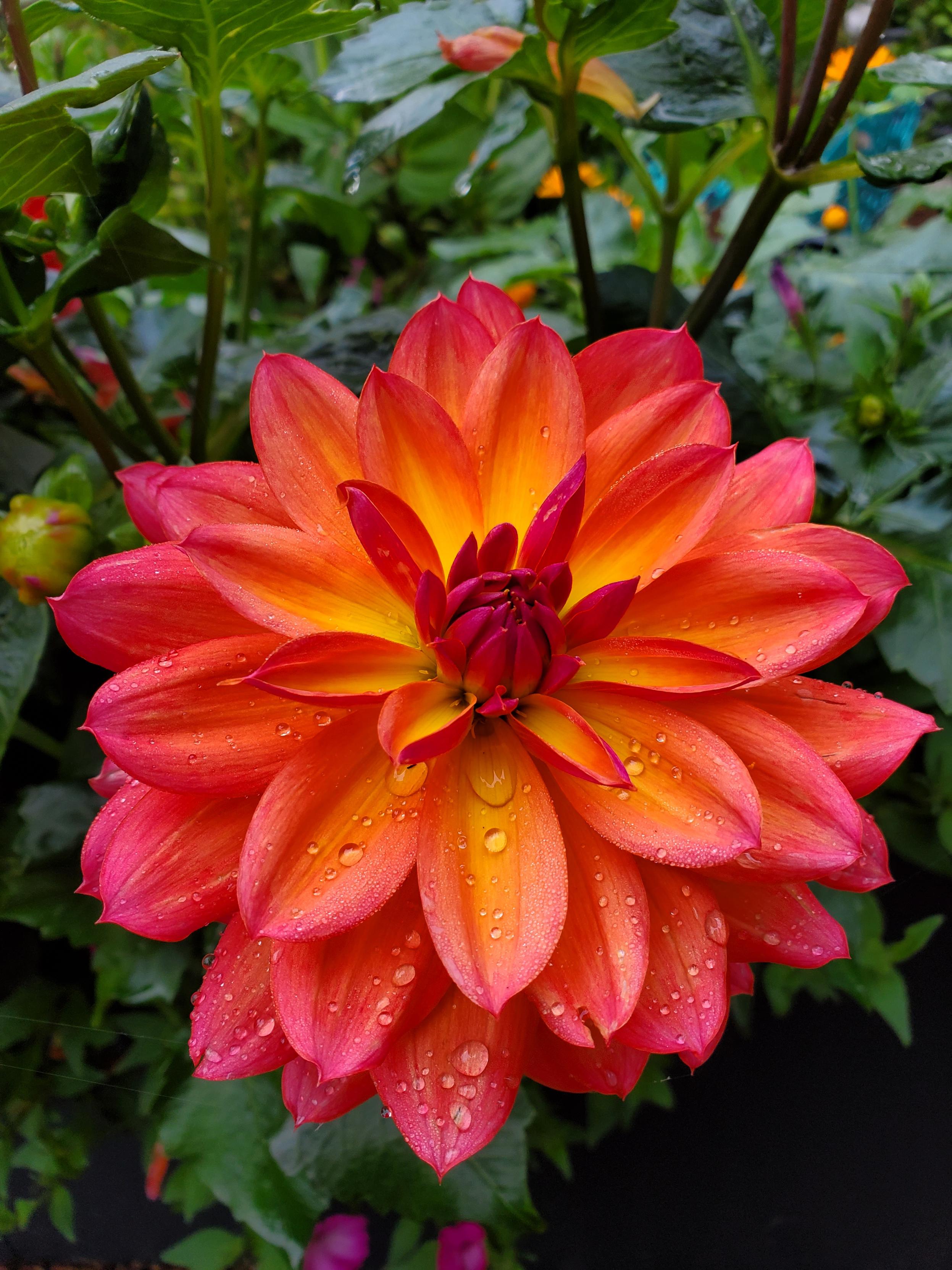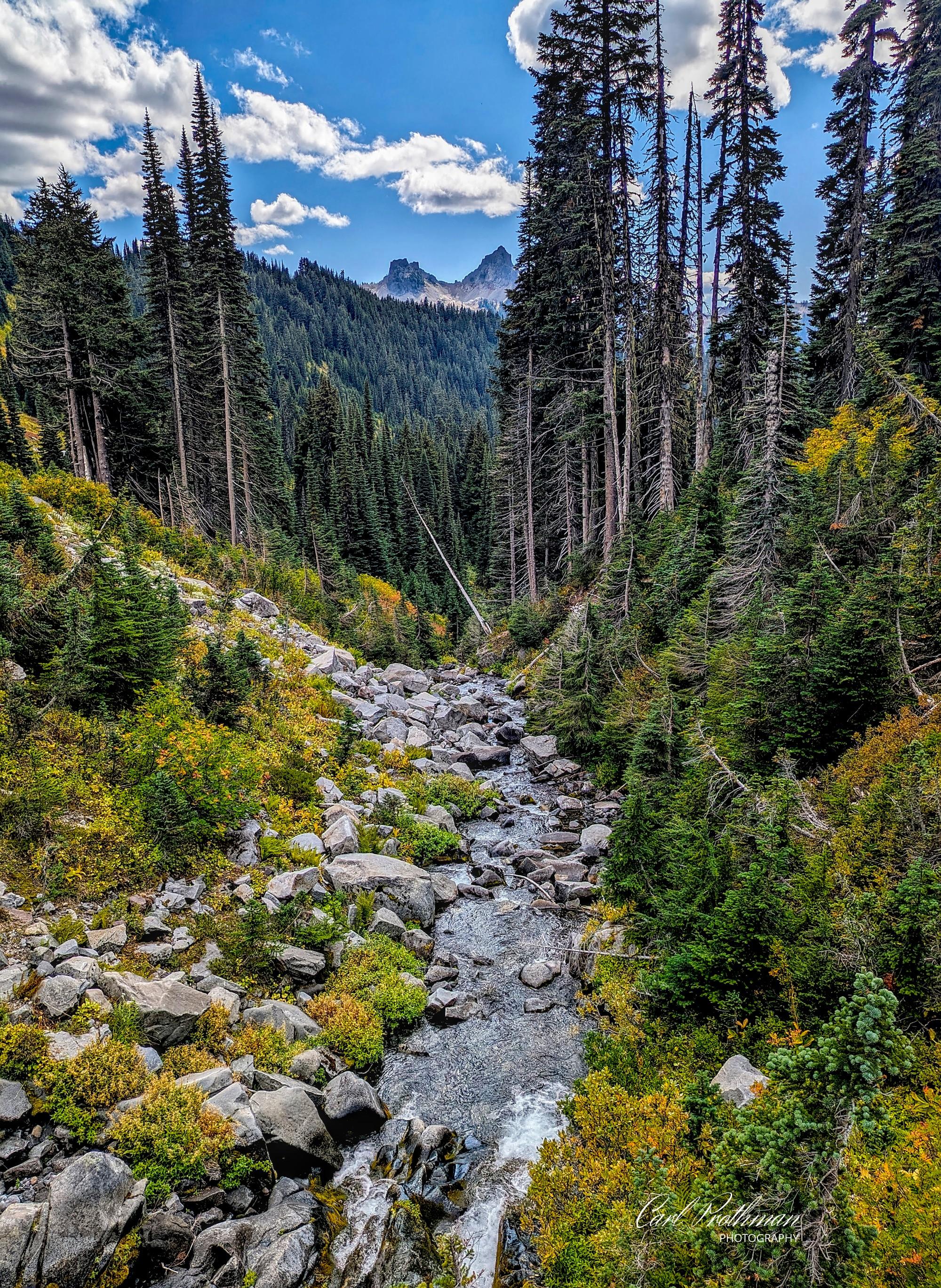 A mountain creek winds down through a rocky alpine valley surrounded by towering evergreens on the southern flank of Mount Rainier National Park. In the distance, two jagged spires, Pinnacle Peak and The Castle, rise dramatically above the dark green forest canopy, part of the rugged Tatoosh Range that cuts across the skyline. The stream glitters as it flows over smooth granite boulders, catching dappled light that filters through the tall firs. The slopes are carpeted with late-summer foliage beginning to shift toward autumn, with bursts of yellow and amber contrasting against deep forest greens. Above, the sky glows a vivid blue, scattered with soft cumulus clouds drifting past the peaks. The overall scene conveys the wild serenity of the Pacific Northwest alpine environment.