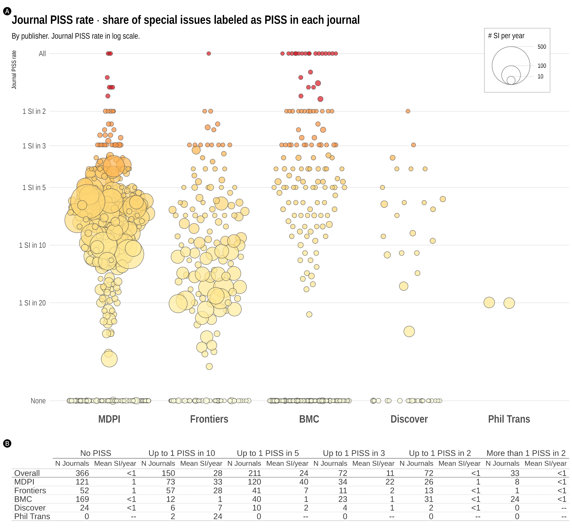 Most PISS comes from journals where only 20-30% of issues are PISS. But when you publish 100s-1000s of special issues per year... oof. Analysing just 904 journals, we find ~16-43k excess endogenous articles in PISS issues. PISS in just these 904 journals rivals #ResearchIntegrity and fraud. 8/n