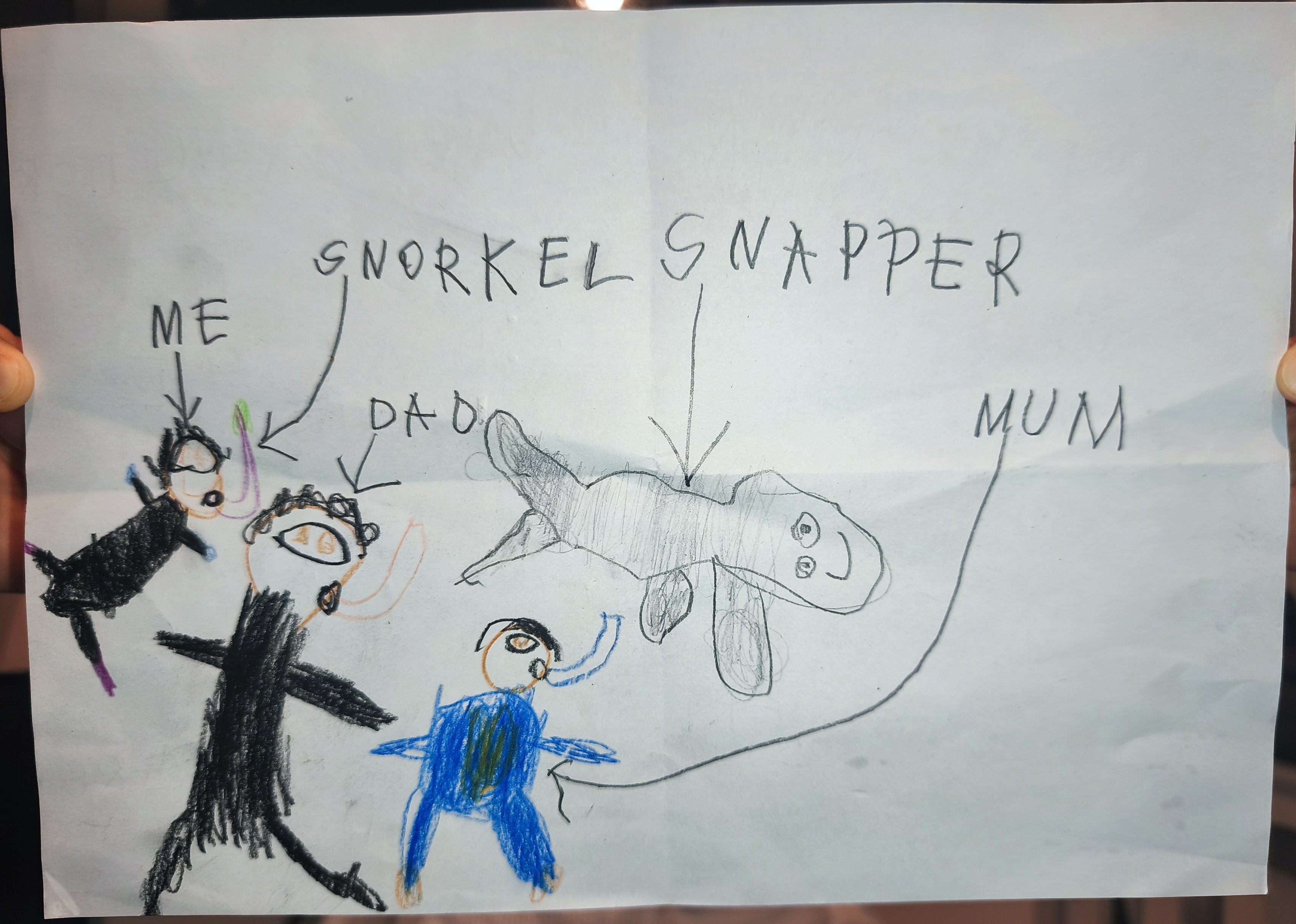 the Little One has made a drawing of the time we went snorkelling in Anchor Bay and saw a shiny Snapper.
