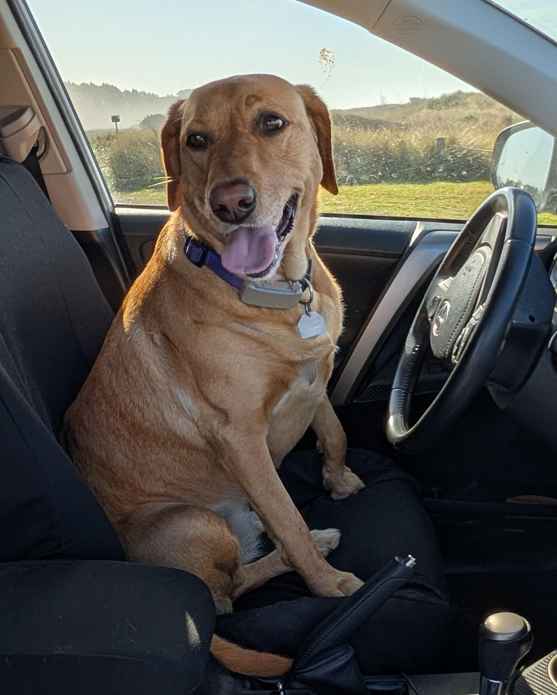 The picture is Summer in the driver's seat for today's walk. She really wants to drive. I tell her maybe someday.