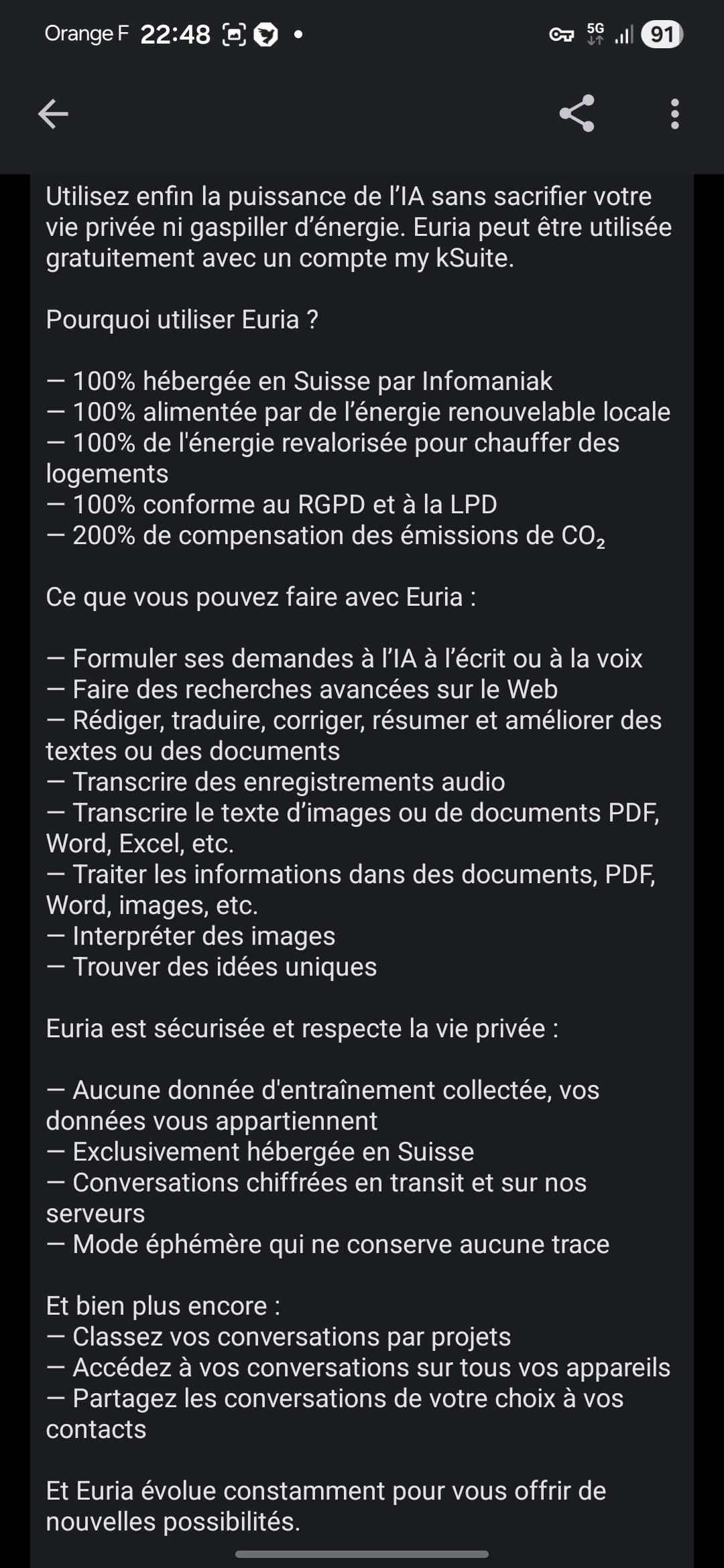 Utilisez enfin la puissance de l’IA sans sacrifier votre vie privée ni gaspiller d’énergie. Euria peut être utilisée gratuitement avec un compte my kSuite.