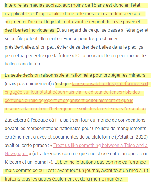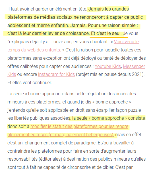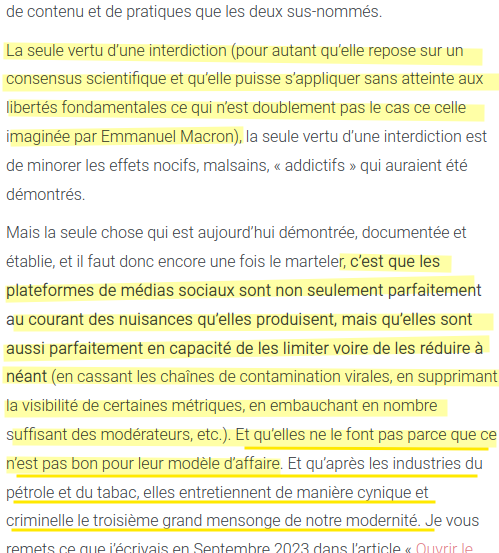 Mais la seule chose qui est aujourd’hui démontrée, documentée et établie, et il faut donc encore une fois le marteler, c’est que les plateformes de médias sociaux sont non seulement parfaitement au courant des nuisances qu’elles produisent, mais qu’elles sont aussi parfaitement en capacité de les limiter voire de les réduire à néant (en cassant les chaînes de contamination virales, en supprimant la visibilité de certaines métriques, en embauchant en nombre suffisant des modérateurs, etc.). Et qu’elles ne le font pas parce que ce n’est pas bon pour leur modèle d’affaire. Et qu’après les industries du pétrole et du tabac, elles entretiennent de manière cynique et criminelle le troisième grand mensonge de notre modernité.
