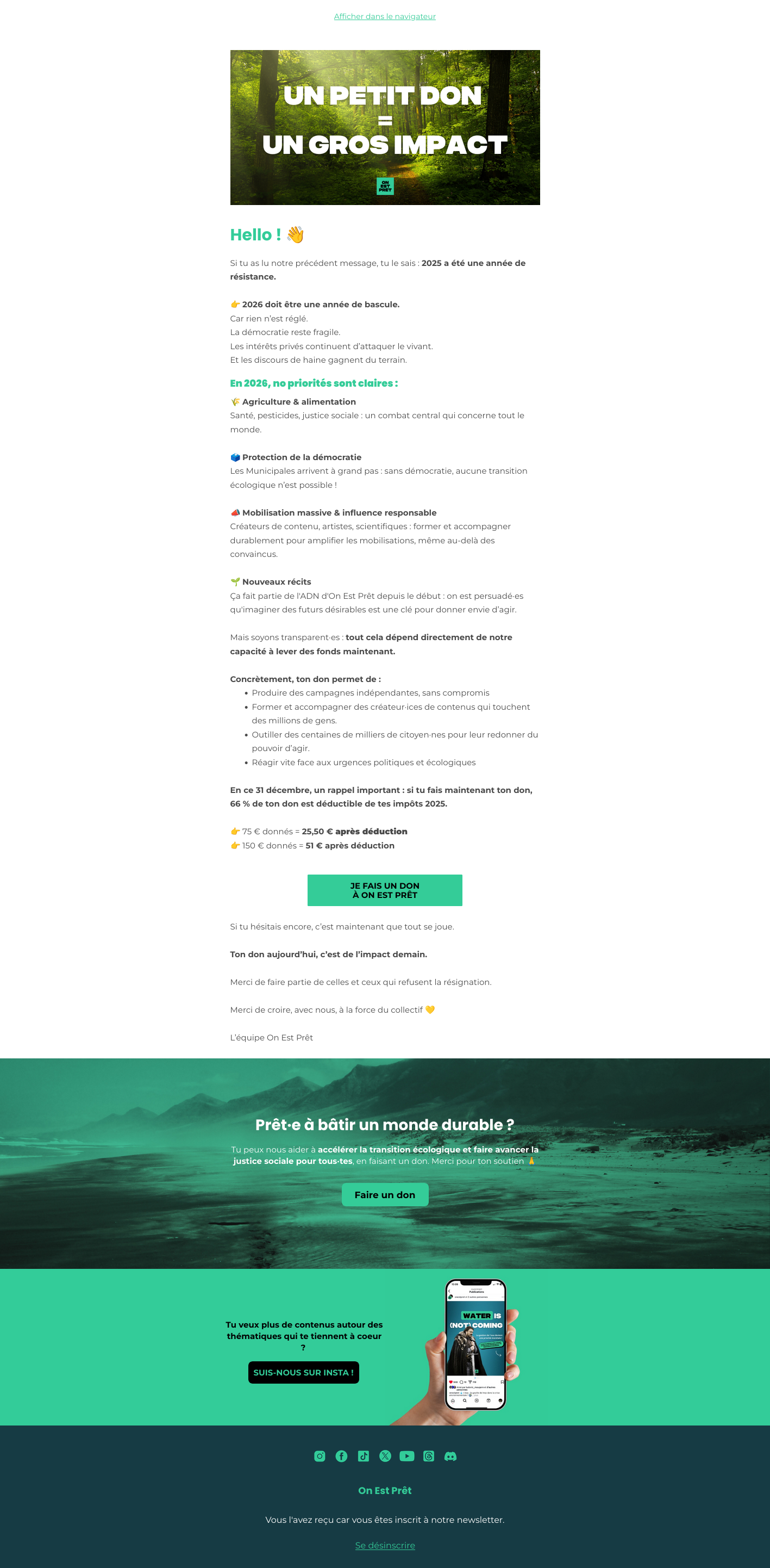En ce 31 décembre, un rappel important : si tu fais maintenant ton don, 66 % de ton don est déductible de tes impôts 2025.