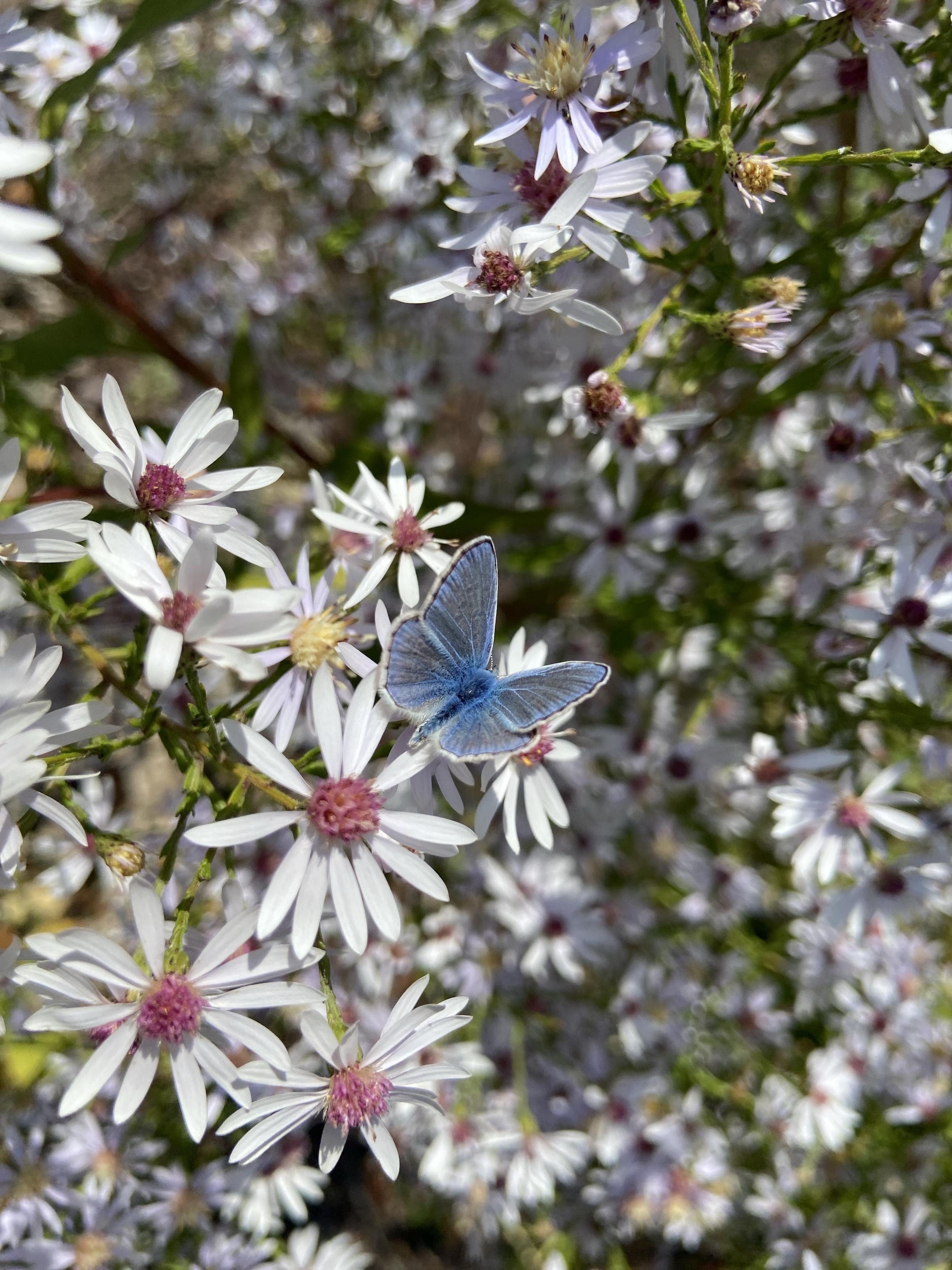 I could post all day the beautiful photos from yesterday and today. Bright sunshine and fall colors. The bumblebees are still loving the asters, as is this little blue butterfly.