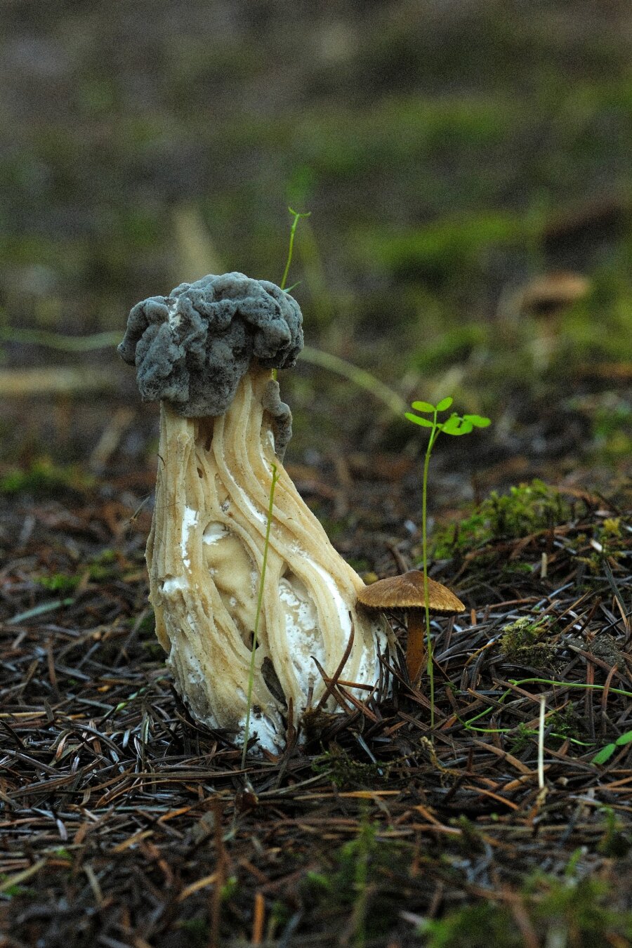 A Western Black Elfin Saddle Mushroom (i think) and his lil buddy.