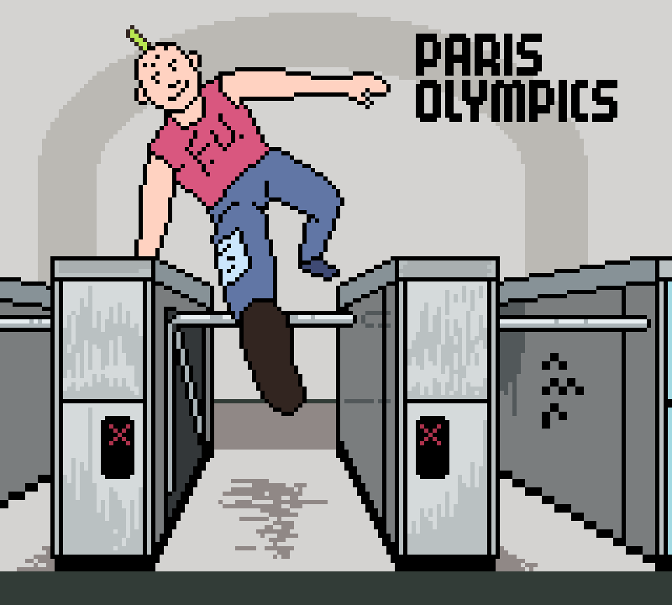 Concept picture for a sarcastic video game about the Paris Olympics. Don't do fraud, kids. #turnstyle for @pixel_dailies #pixelart #pixel_dailies #ドット絵 #parismetro #punk #videogame #paris #fraud #pixel #art #parisolympics