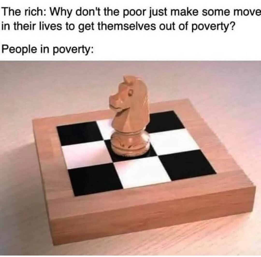 The rich: "Why don't the poor just make some move in their lives to get themselves out of poverty?" The poor: [Picture of a knight chess piece in the middle of a 3x3 chess board, making it impossible to move since a knight can only do two steps forward and one to the side but the chessboard is too small for that]
