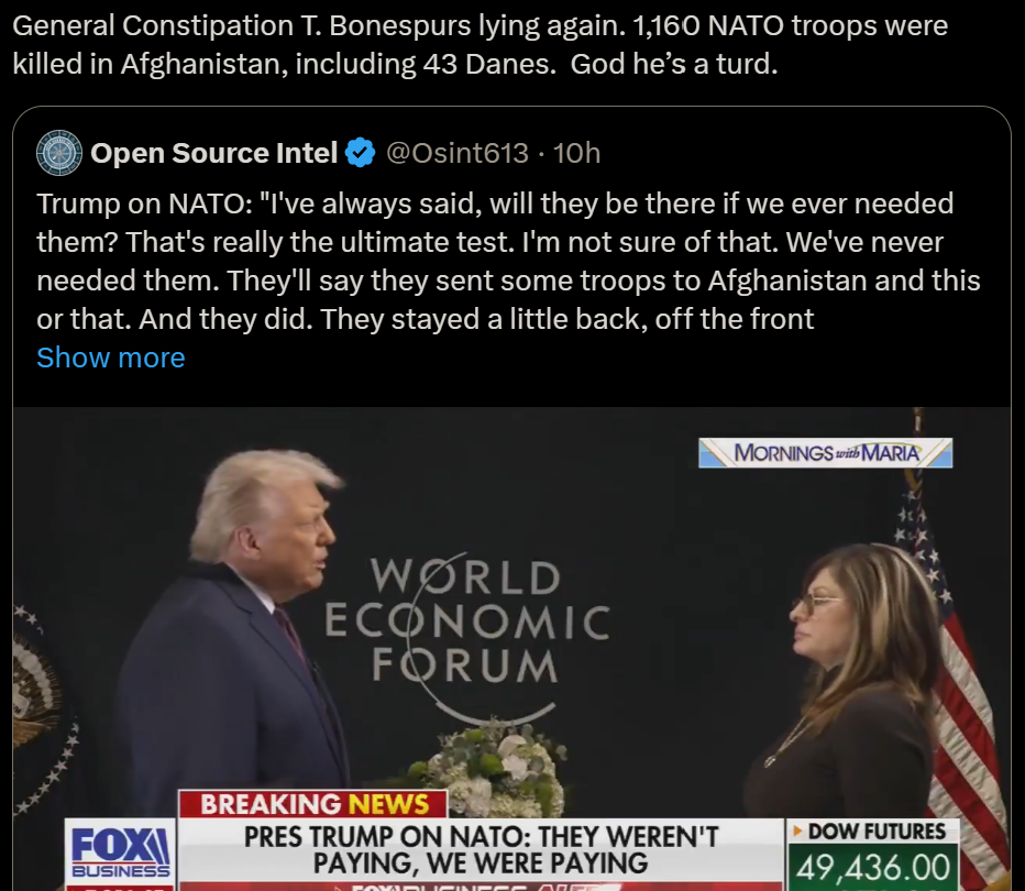 Amount of blood #US has expended defending Greenland: zero. Amount of blood #Denmark has expended defending the US: 43 Danish soldiers gave their lives in Afghanistan, responding to a US appeal under article 5 of #NATO. Our allies deserve far better than the treasonous conduct of this administration.
