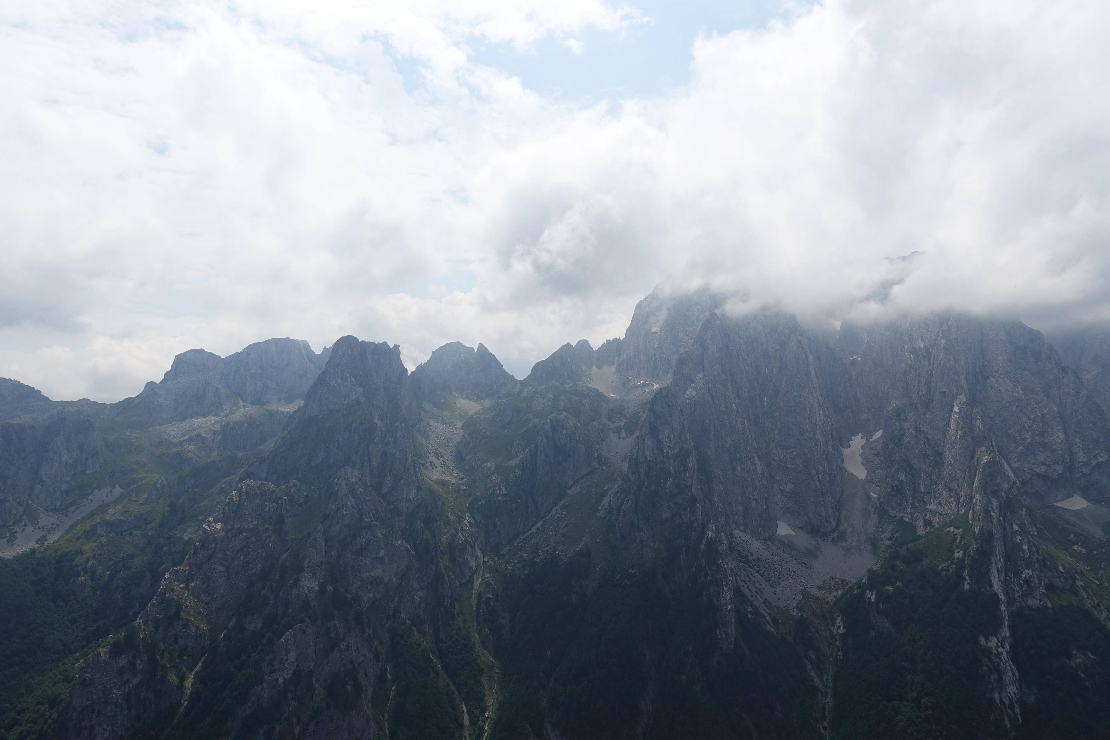 Eine Bergkette mit einem wolkenverhangenen Himmel.