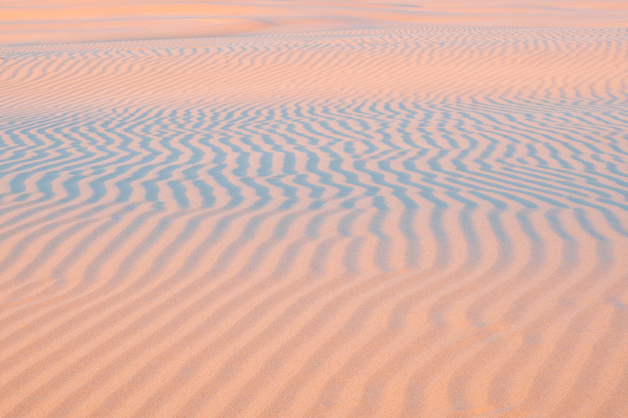 closeup of the desert sand during sunrise. Shifting and winding sand ripples with changing shadows depth create dizzying patterns