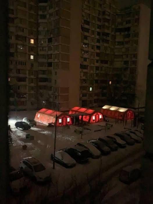 A woman walks past a tent of a government-run humanitarian aid point, where residents can warm up, charge their devices, and get hot drinks and psychological support, installed next to apartment buildings during a power blackout after critical civil infrastructure was hit by recent Russian missile and drone strikes, amid Russia's attack on Ukraine, in #Kyiv, #Ukraine. REUTERS/Valentyn Ogirenko
