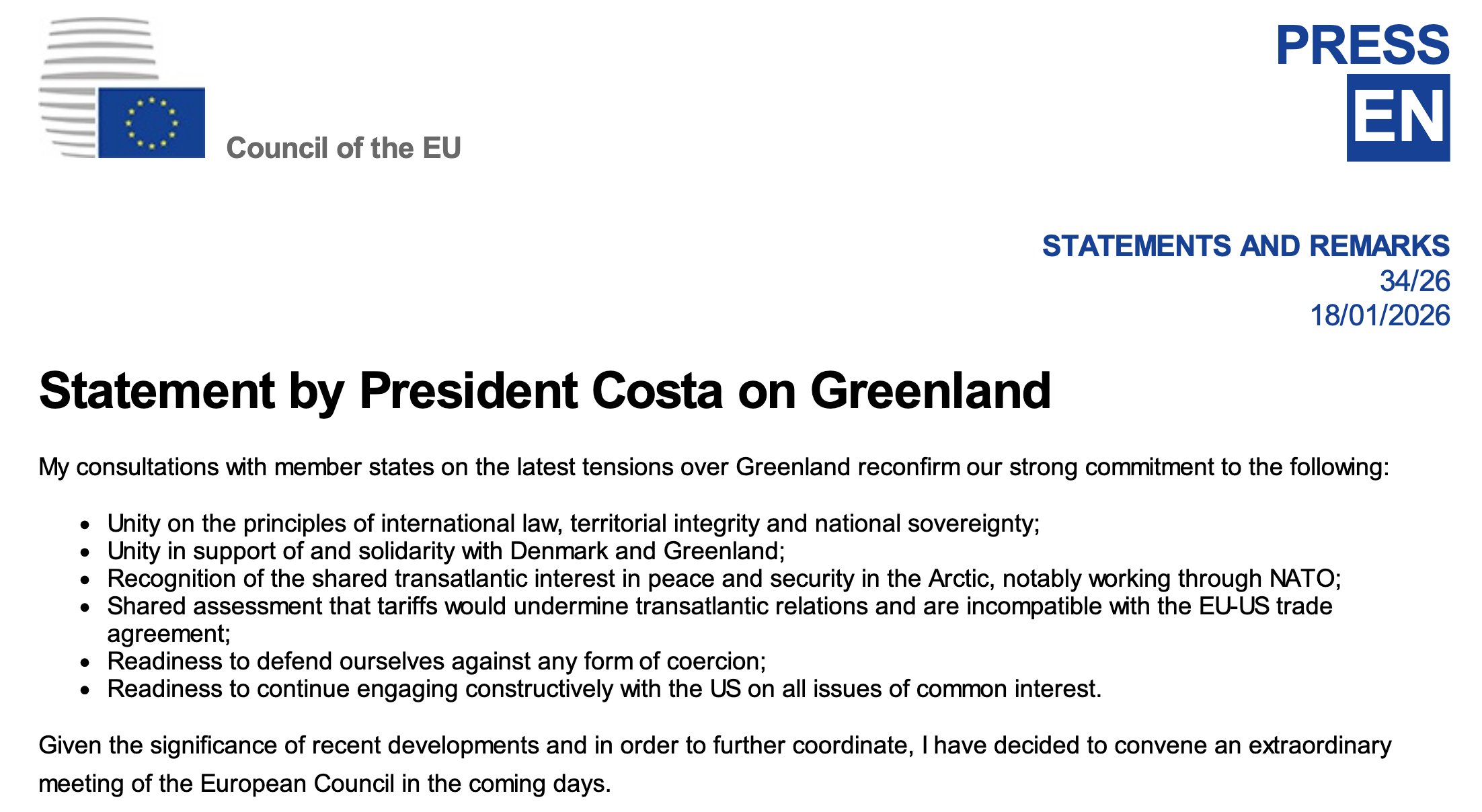 BREAKING: emergency EU Summit on #Greenland with the EU's 27 Heads of State & Government in the coming days.