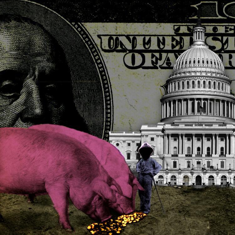 The Capitol building. In the foreground are two gigantic pigs - the size of elephants. They are being fed by a male figure whose head has been replaced with a shadowy hacker's hoodie. The background is a dark, blown up US$100 bill with Franklin's eyes gone black.