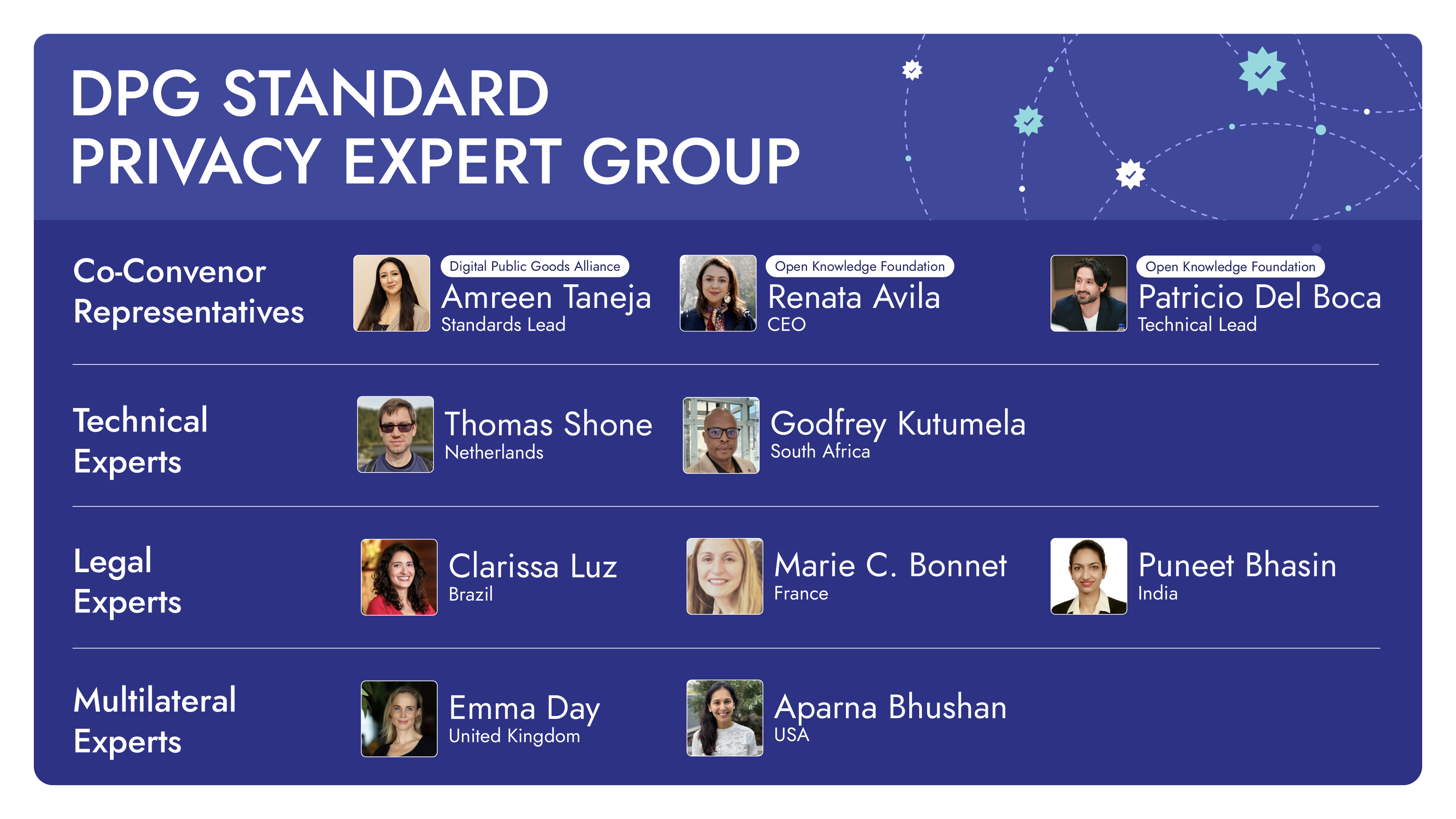 Graphic introducing the DPG Standard Privacy Expert Group. Lists co-convenor representatives Amreen Taneja, Renata Ávila, and Patricio Del Boca; technical experts Thomas Shone and Godfrey Kutumela; legal experts Clarissa Luz, Marie C. Bonnet, and Puneet Bhasin; and multilateral experts Emma Day and Aparna Bhushan.
