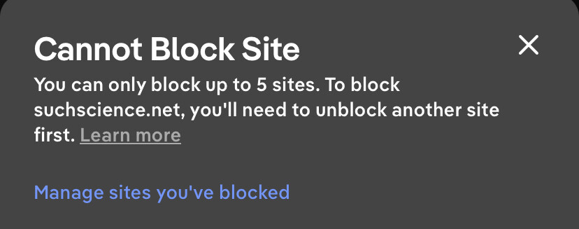 That could be something that could make searching the enshittified web bareable again, but then they limit it to 5 websites you can block. Why?!?!