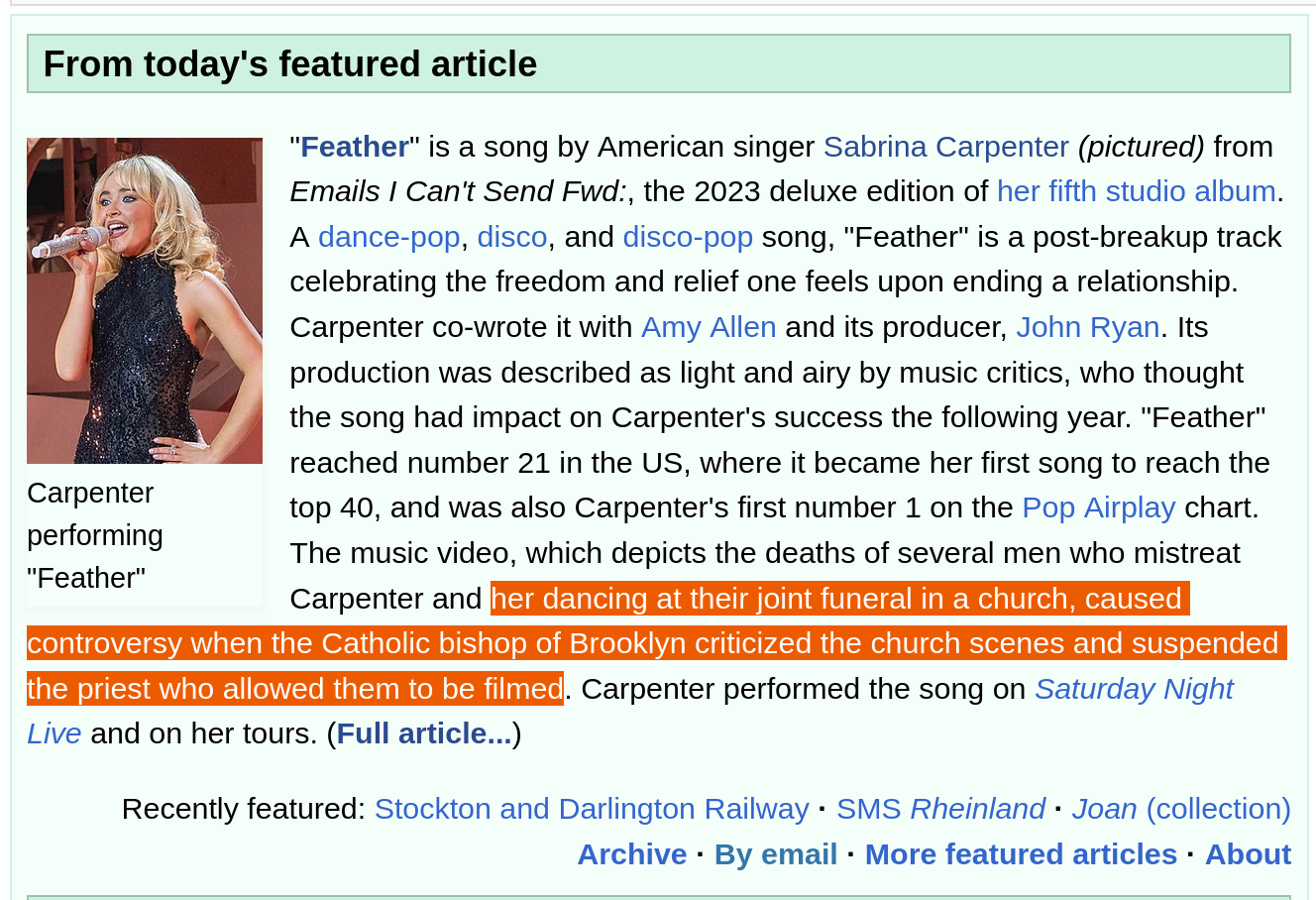 "Feather" is a song by American singer Sabrina Carpenter (pictured) from Emails I Can't Send Fwd:, the 2023 deluxe edition of her fifth studio album. A dance-pop, disco, and disco-pop song, "Feather" is a post-breakup track celebrating the freedom and relief one feels upon ending a relationship. Carpenter co-wrote it with Amy Allen and its producer, John Ryan. Its production was described as light and airy by music critics, who thought the song had impact on Carpenter's success the following year. "Feather" reached number 21 in the US, where it became her first song to reach the top 40, and was also Carpenter's first number 1 on the Pop Airplay chart. The music video, which depicts the deaths of several men who mistreat Carpenter and her dancing at their joint funeral in a church, caused controversy when the Catholic bishop of Brooklyn criticized the church scenes and suspended the priest who allowed them to be filmed. Carpenter performed the song on Saturday Night Live and on her tours. (Full article...)