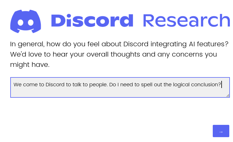 So there's apparently a survey circulating in which Discord is asking about people's opinions on integrating AI.