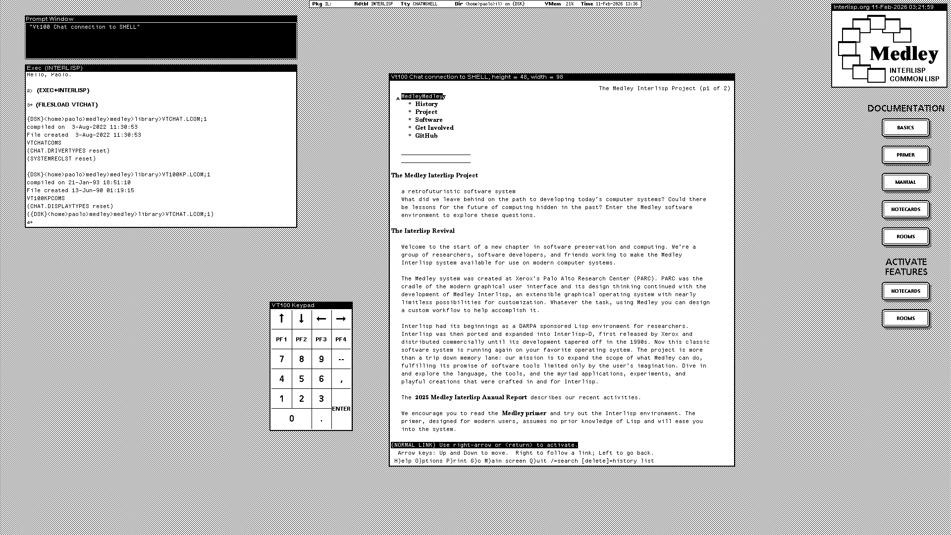 Visiting interlisp.org with the Lynx web browser on Medley Interlisp. The main window is a VT100 terminal emulator running Lynx on the host operating system, Linux in this case. The smaller window next to the terminal is a VT100 keypad.