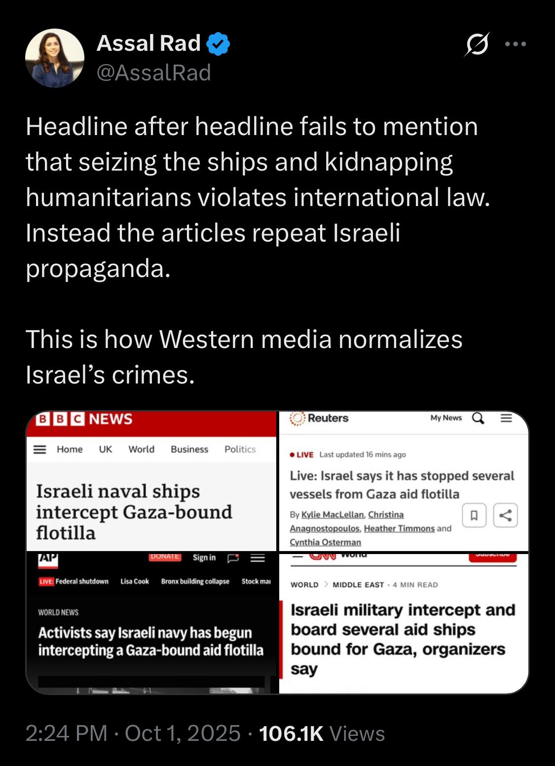 Headline after headline fails to mention that seizing the ships and kidnapping humanitarians violates international law. Instead the articles repeat Israeli propaganda.
