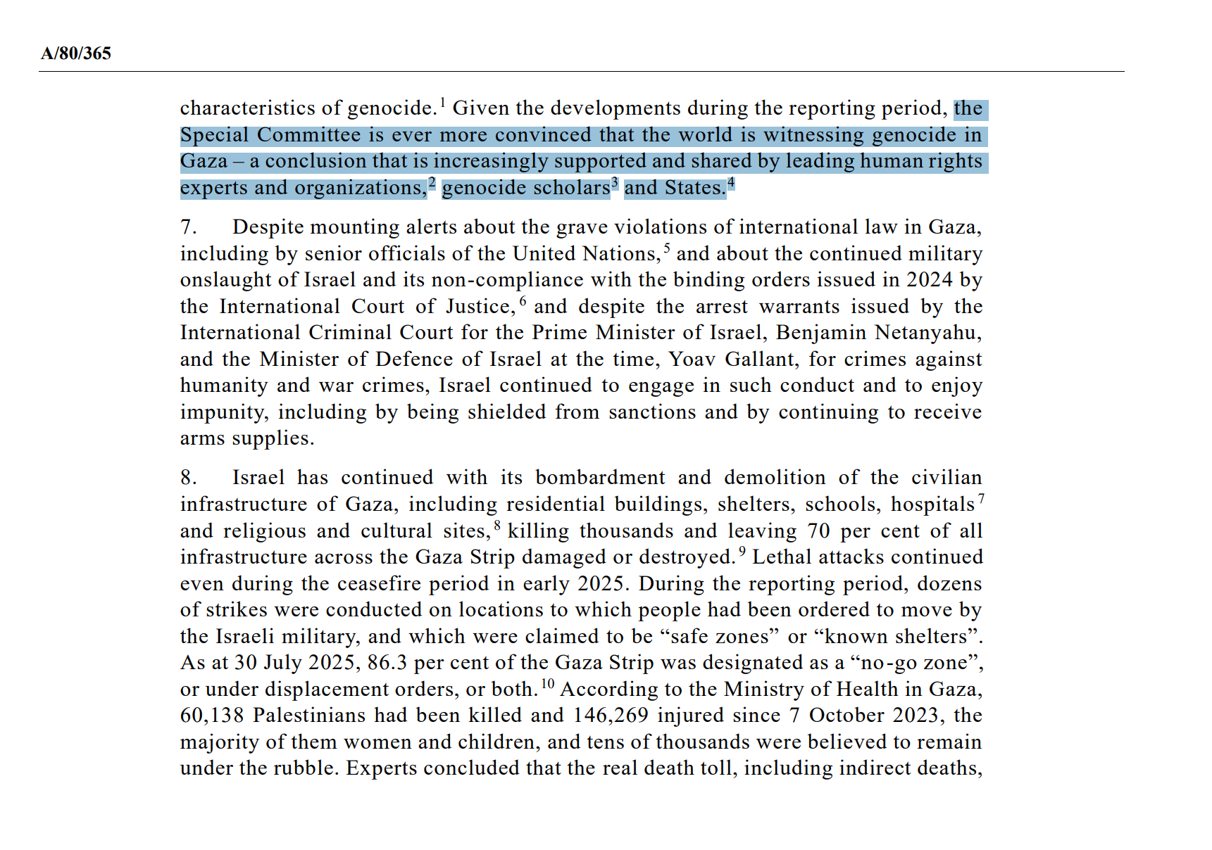 "the Special Committee is ever more convinced that the world is witnessing genocide in Gaza – a conclusion that is increasingly supported and shared by leading human rights experts and organizations, genocide scholars and States".
