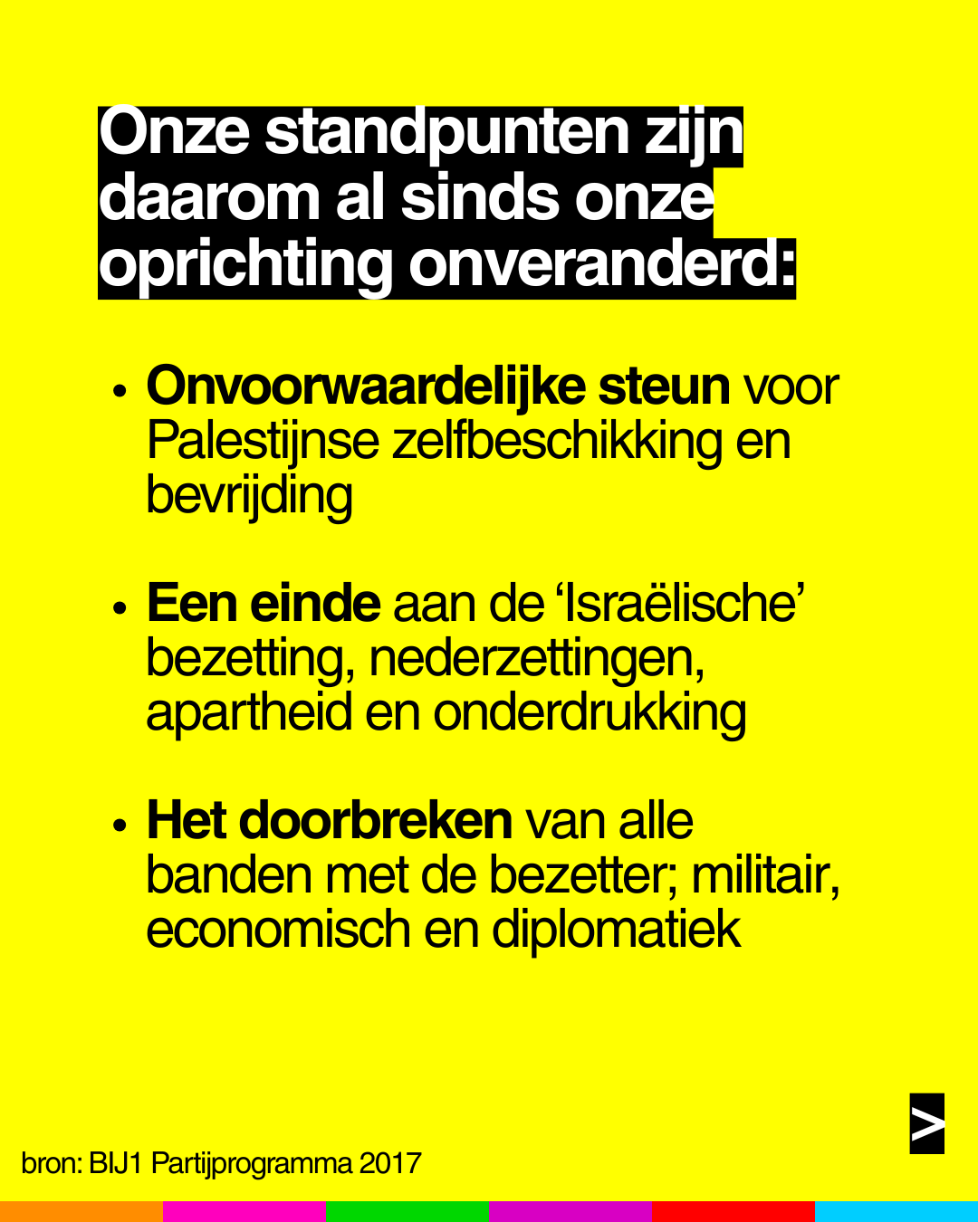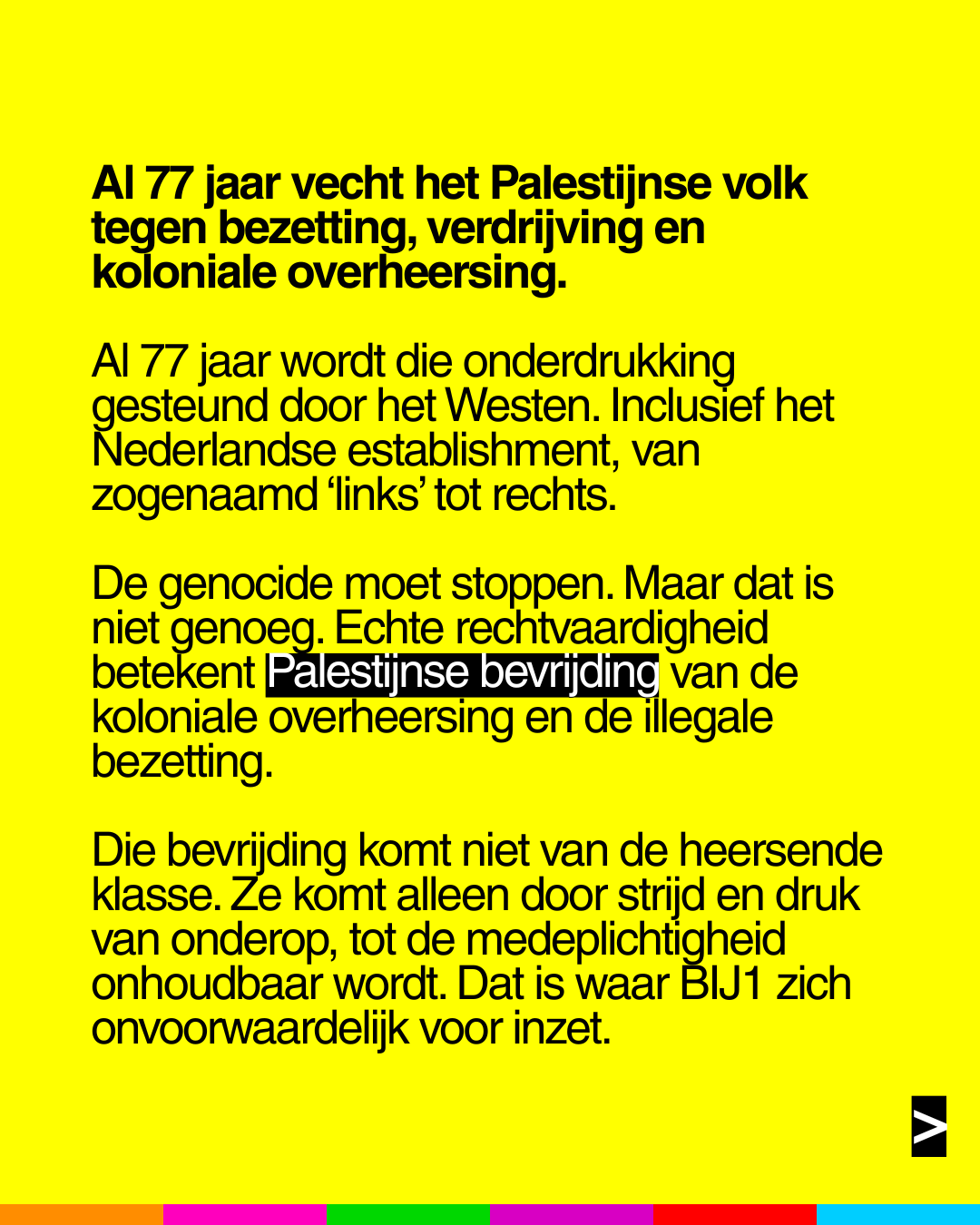 Die bevrijding komt niet van de heersende klasse. Ze komt alleen door strijd en druk van onderop, tot de medeplichtigheid onhoudbaar wordt. Dat is waar #BIJ1 zich onvoorwaardelijk voor inzet.