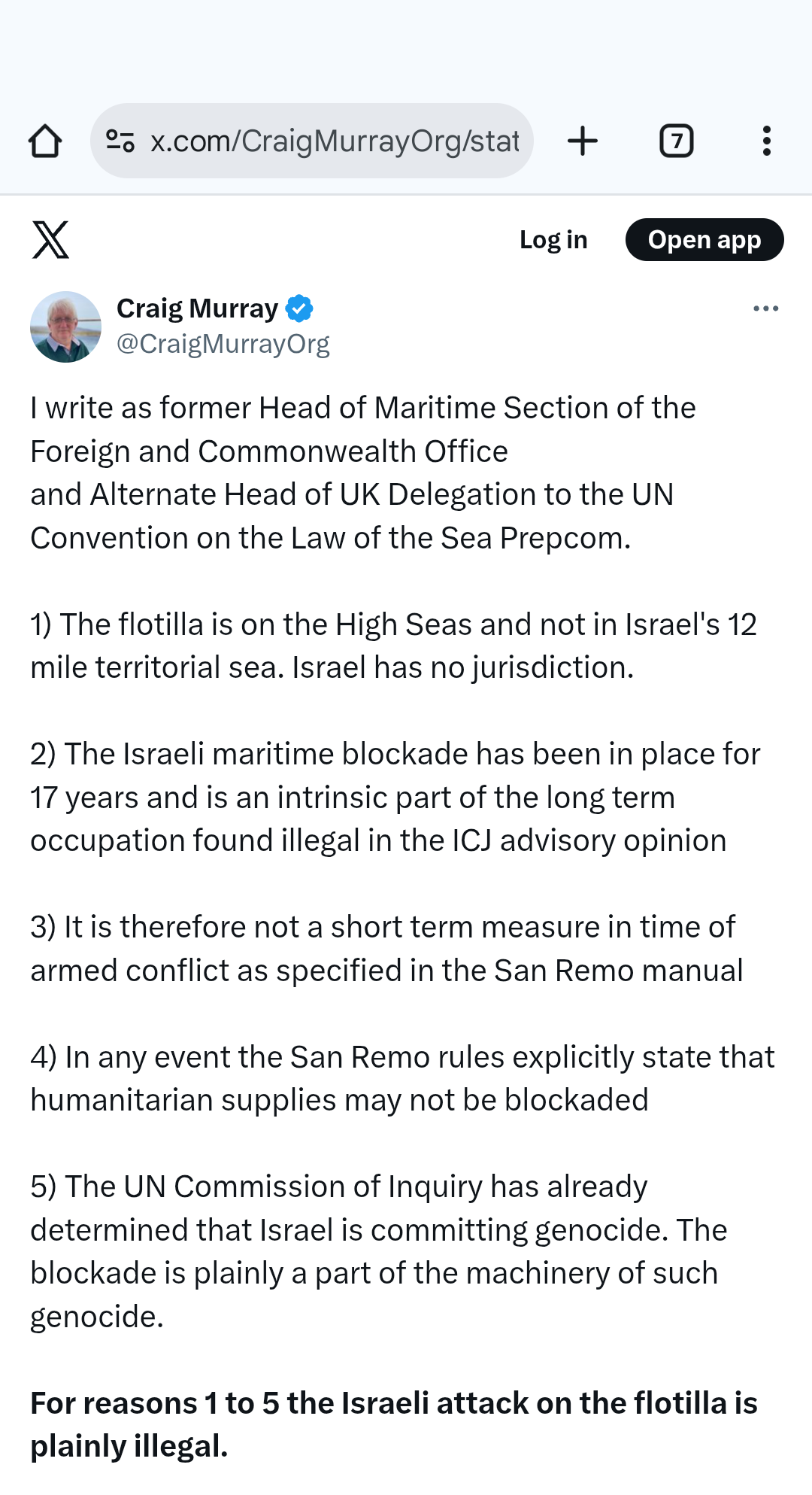 Twitter screenshot part 1: Craig Murray @CraigMurrayOrg I write as former Head of Maritime Section of the Foreign and Commonwealth Office and Alternate Head of UK Delegation to the UN Convention on the Law of the Sea Prepcom. 1) The flotilla is on the High Seas and not in Israel's 12 mile territorial sea. Israel has no jurisdiction. 2) The Israeli maritime blockade has been in place for 17 years and is an intrinsic part of the long term occupation found illegal in the ICJ advisory opinion 3) It is therefore not a short term measure in time of armed conflict as specified in the San Remo manual 4) In any event the San Remo rules explicitly state that humanitarian supplies may not be blockaded 5) The UN Commission of Inquiry has already determined that Israel is committing genocide. The blockade is plainly a part of the machinery of such genocide. For reasons 1 to 5 the Israeli attack on the flotilla is plainly illegal.