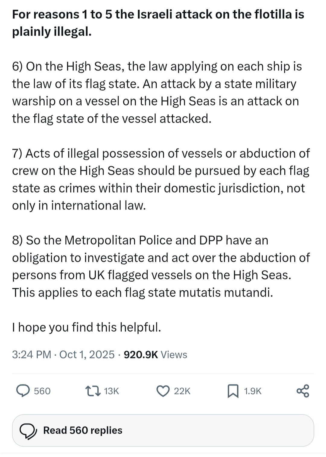 Twitter screenshot part 2: For reasons 1 to 5 the Israeli attack on the flotilla is plainly illegal. 6) On the High Seas, the law applying on each ship is the law of its flag state. An attack by a state military warship on a vessel on the High Seas is an attack on the flag state of the vessel attacked. 7) Acts of illegal possession of vessels or abduction of crew on the High Seas should be pursued by each flag state as crimes within their domestic jurisdiction, not only in international law. 8) So the Metropolitan Police and DPP have an obligation to investigate and act over the abduction of persons from UK flagged vessels on the High Seas. This applies to each flag state mutatis mutandi. I hope you find this helpful. 3:24 PM • Oct 1, 2025 • 920. 9K Views