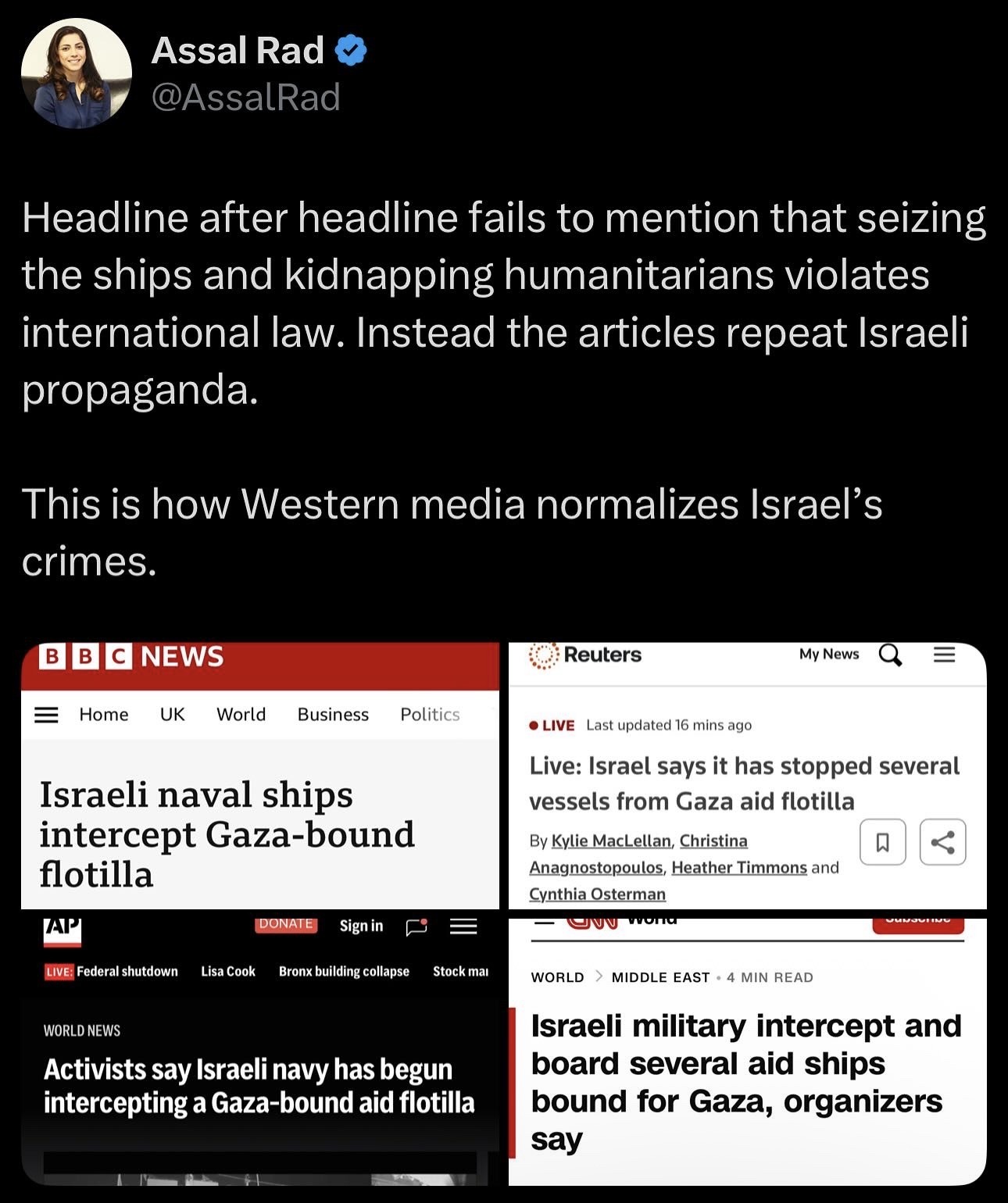 text of microblog screenshot: Assal Rad @AssalRad Headline after headline fails to mention that seizing the ships and kidnapping humanitarians violates international law. Instead the articles repeat Israeli propaganda. This is how Western media normalizes Israel's crimes. embedded screenshot 1 (BBC News headline): Israeli naval ships intercept Gaza-bound flotilla embedded screenshot 2 (Reuters headline): Live: Israel says it has stopped several vessels from Gaza aid flotilla embedded screenshot 3 (AP headline): Activists say Israeli navy has begun intercepting a Gaza-bound aid flotilla embedded screenshot 4 (CNN headline): Israeli military intercept and board several aid ships bound for Gaza, organizers say