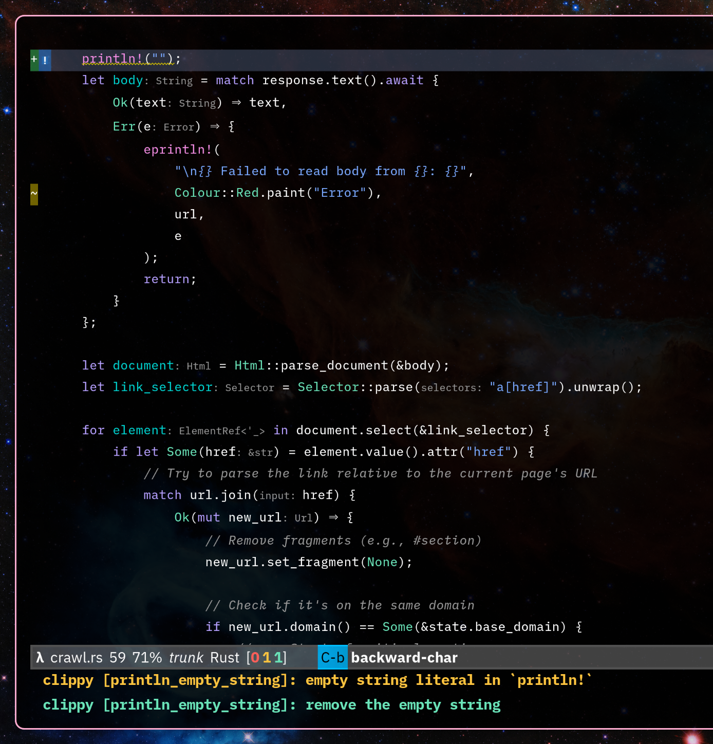 With a tiny manifest and a small Emacs configuration, you get a powerful, reproducible, elegant Rust development environment.