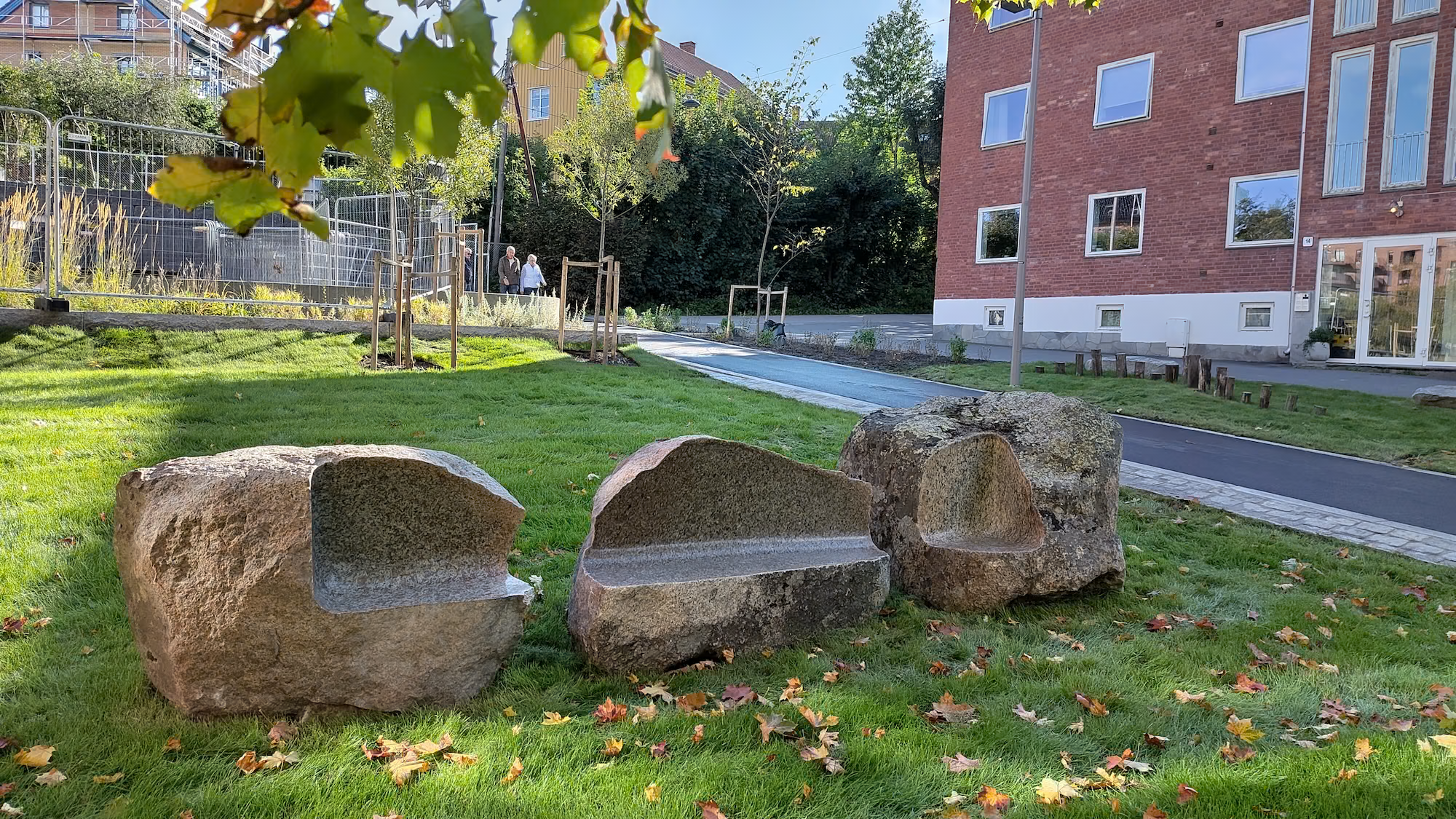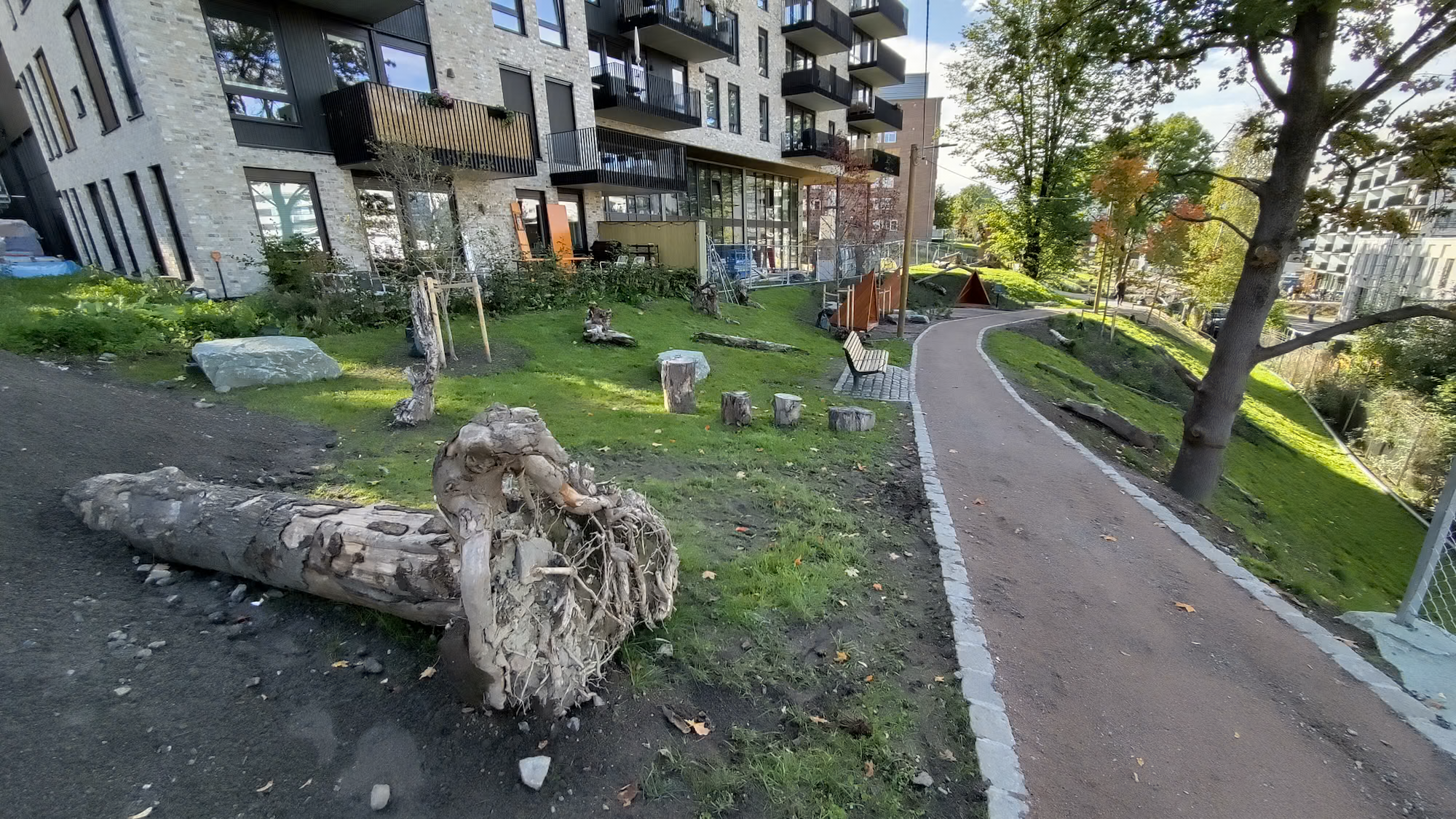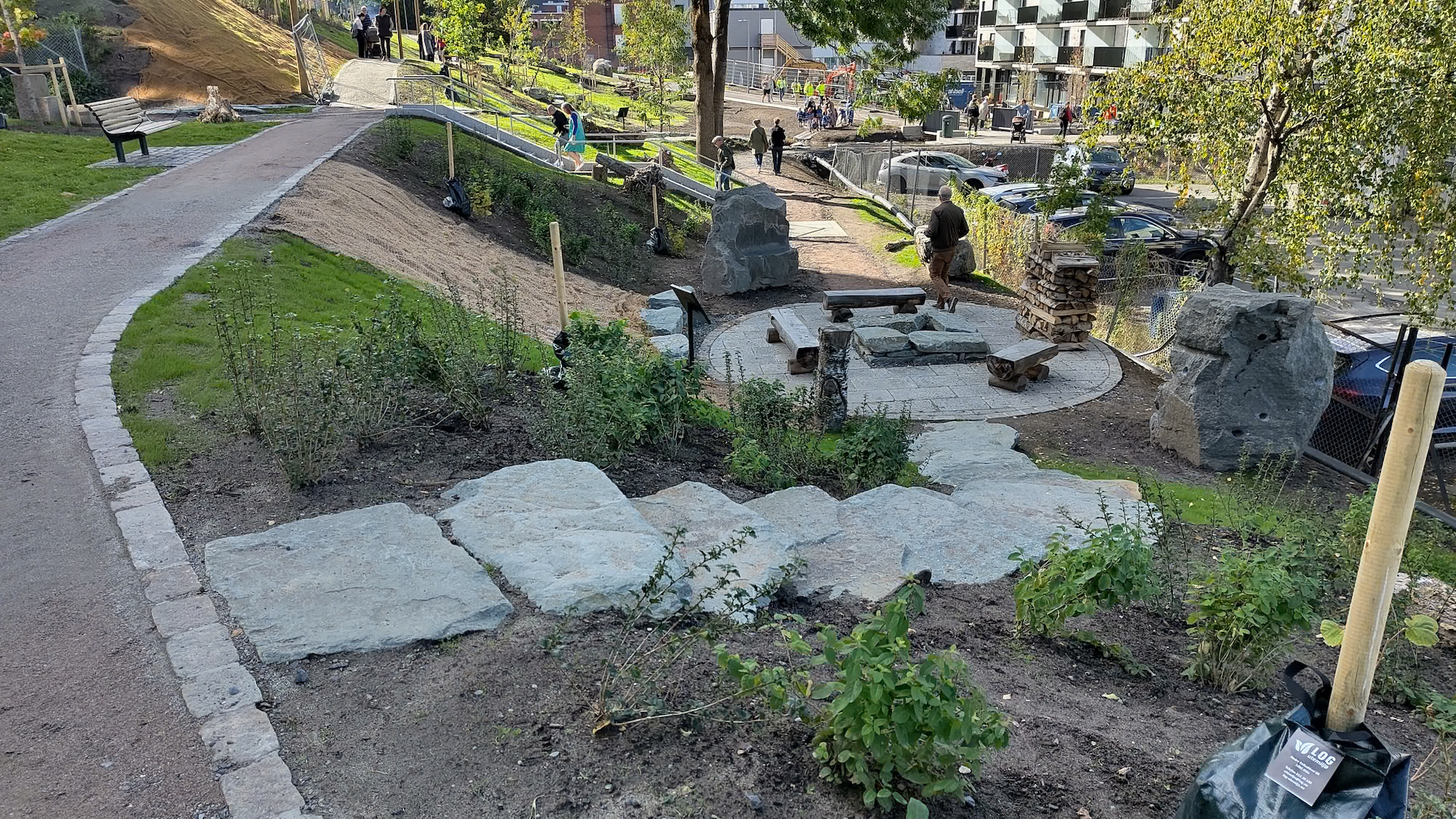 Bekk, trær, stauder, benker, kunst som kan sittes og klatres på, bålplasser, overvannshåndtering, mange fine skilt med info, fugle- og flaggermuskasser, pinnsvin-hus, mye bruk av naturmaterialer, mye bruk av døde trestammer og røtter, til pynt, lek og biotoper for masse liv (det er mer liv i døde trær enn i levende)…