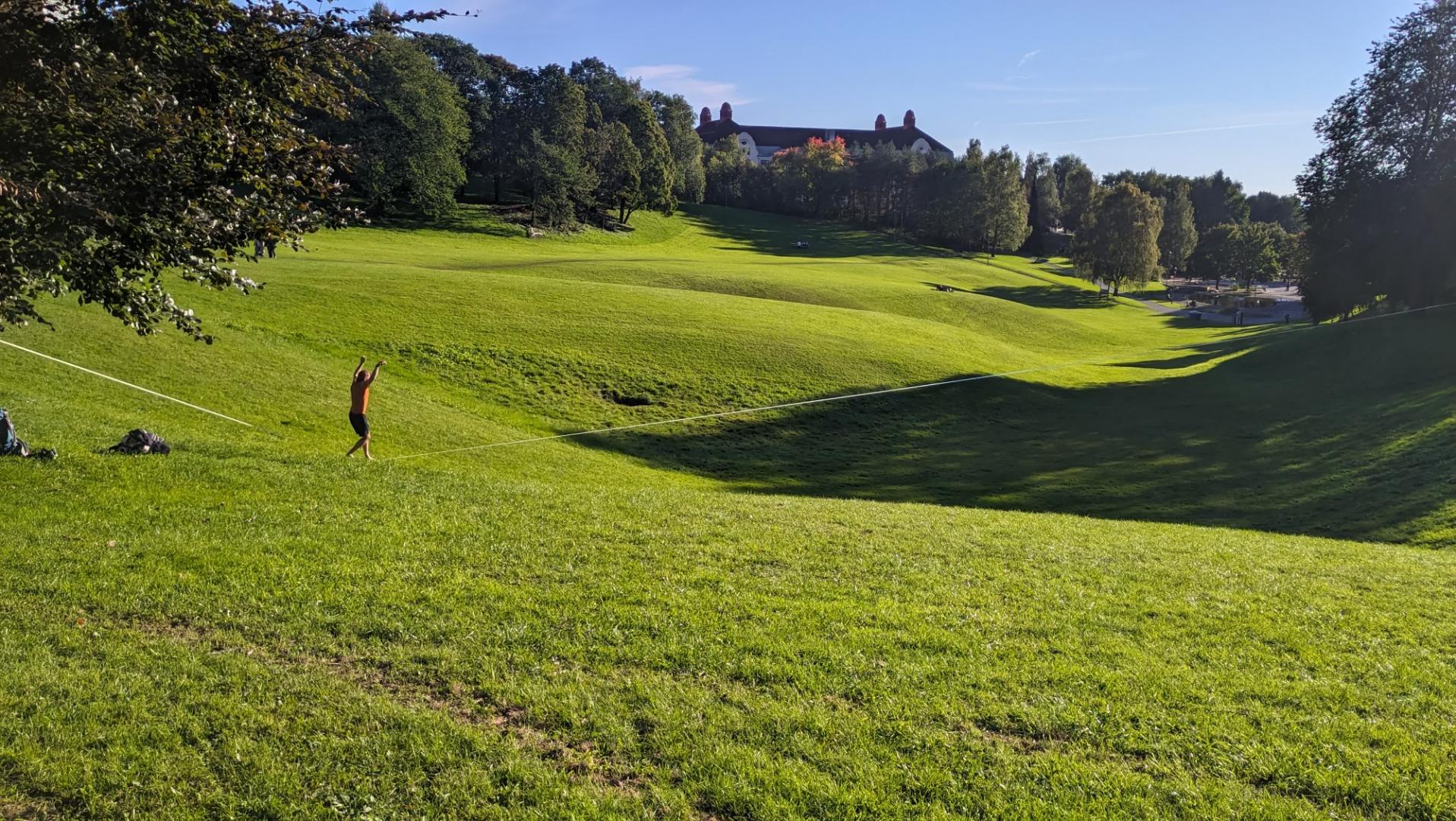 En skikkelig fin hverdsgsopplevelse som bare kunne skje fordi vi har store, offentlige parker, hvor folk kan henge opp hundre meter lange liner og treffe tilfeldige folk som kommer forbi. Uavhengig av økonomi, på tvers av grupper. Prøv det i en hage.