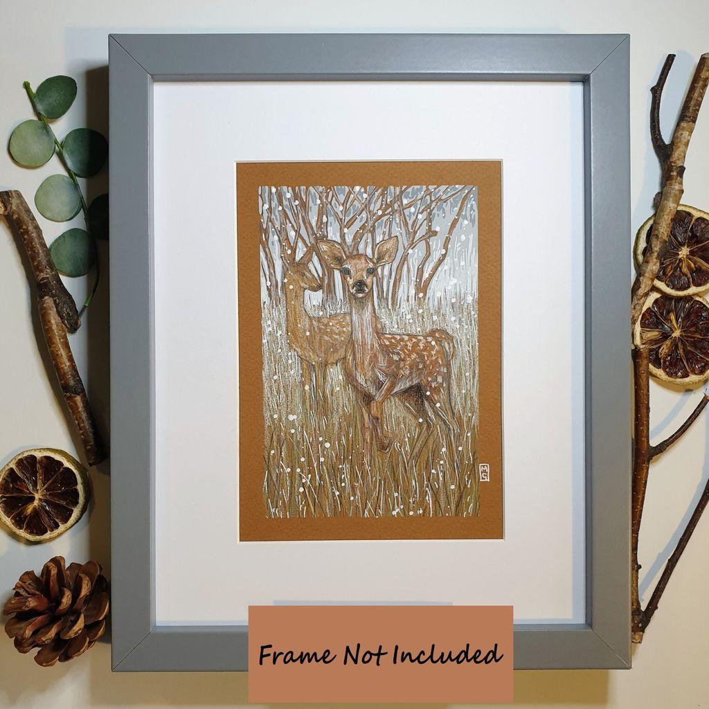 Photographie noir et blanc d'un paysage hivernal, un jour de tempête de neige, montrant trois chevreuils dans dans le bord d'une rue enneigée, avec des congères et de grands conifères sombres à gauche. Les trois chevreuils regardent vers la photographe, avec leurs oreilles dressées. Derrière, la rue bordée d'arbres et enneigée monte et tourne vers la droite, se perdant dans le blizzard. La neige qui tombe fortement du ciel est visible vis-à-vis des conifères sombres.