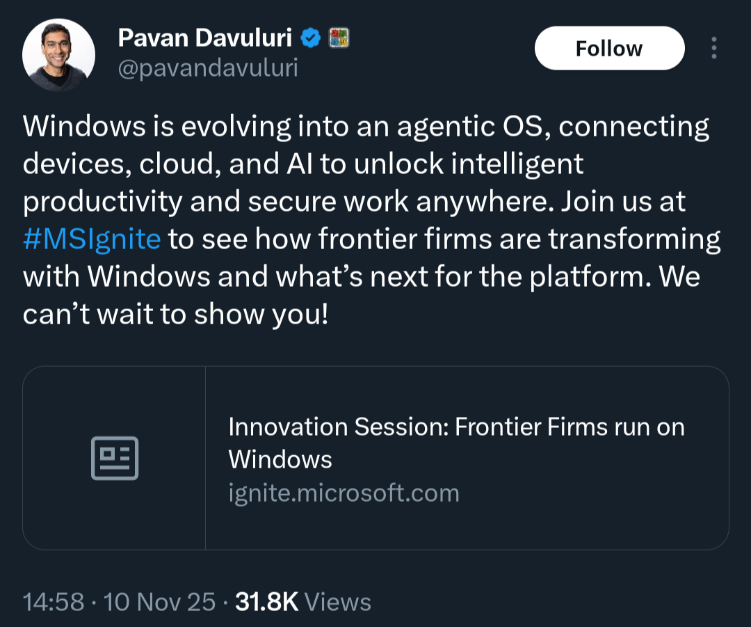 The President of Windows blocked replies to his mental Agentic OS tweet.