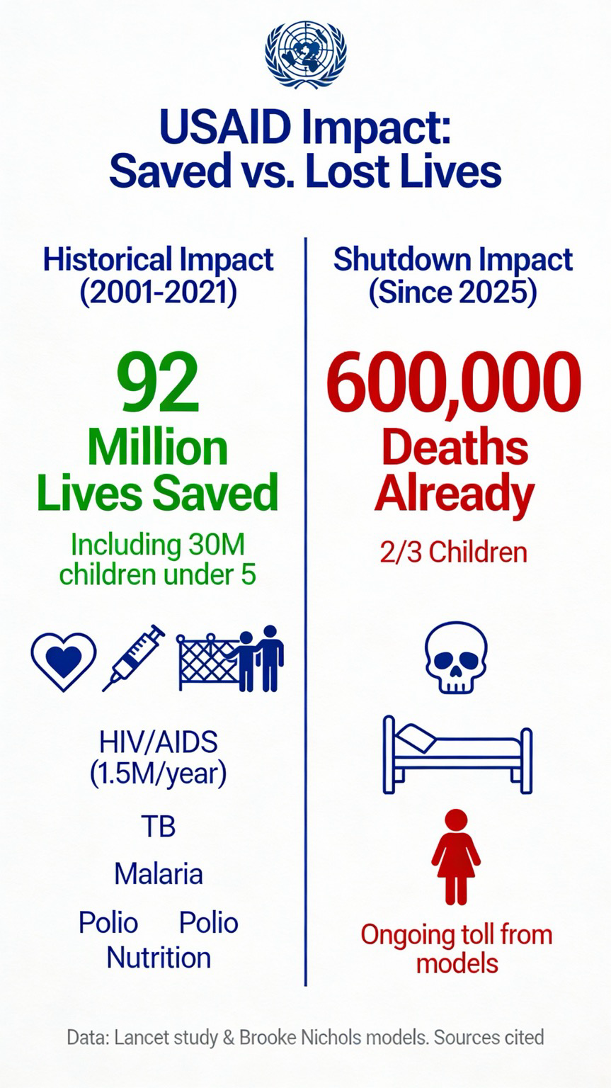 USAID (2001-2021): Saved 92M lives, incl. 30M kids under 5 (HIV/TB/malaria/polio/nutrition). Post-2025 shutdown: 600K deaths already, 2/3 children. Infographic attached. Sources: Lancet study, Brooke Nichols models. #GlobalHealth #USAID #PublicHealth