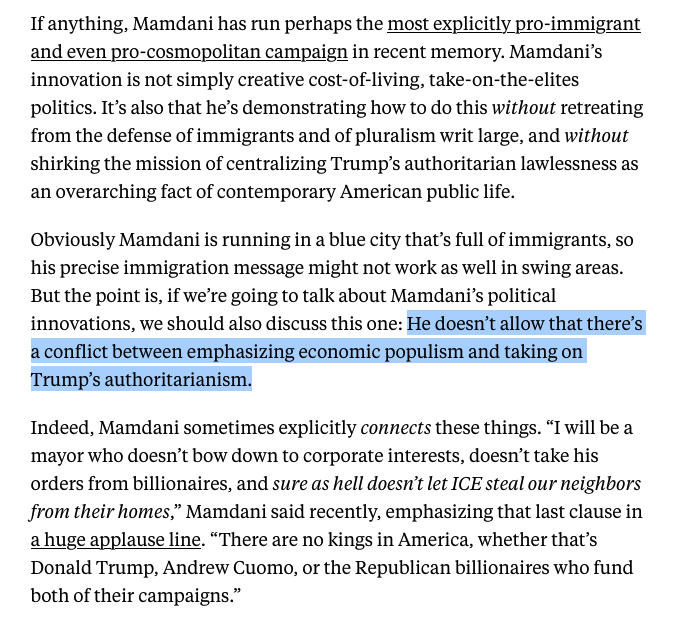 If anything, Mamdani has run perhaps the most explicitly pro-immigrant and even pro-cosmopolitan campaign in recent memory. Mamdani’s innovation is not simply creative cost-of-living, take-on-the-elites politics. It’s also that he’s demonstrating how to do this without retreating from the defense of immigrants and of pluralism writ large, and without shirking the mission of centralizing Trump’s authoritarian lawlessness as an overarching fact of contemporary American public life. Obviously Mamdani is running in a blue city that’s full of immigrants, so his precise immigration message might not work as well in swing areas. But the point is, if we’re going to talk about Mamdani’s political innovations, we should also discuss this one: He doesn’t allow that there’s a conflict between emphasizing economic populism and taking on Trump’s authoritarianism. Indeed, Mamdani sometimes explicitly connects these things. “I will be a mayor who doesn’t bow down to corporate interests, doesn’t take his orders from billionaires, and sure as hell doesn’t let ICE steal our neighbors from their homes,” Mamdani said recently, emphasizing that last clause in a huge applause line. “There are no kings in America, whether that’s Donald Trump, Andrew Cuomo, or the Republican billionaires who fund both of their campaigns.”
