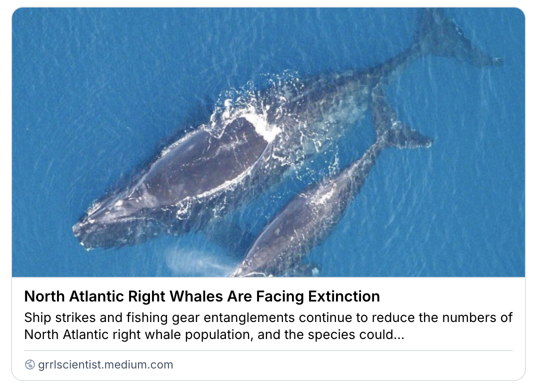 #Whales #Endangered #Extinction #conservation #Whaling #ShipStrikes #FishingGear #FishingGearEntanglements https://grrlscientist.medium.com/north-atlantic-right-whales-are-facing-extinction-c9e6ac60e2c8