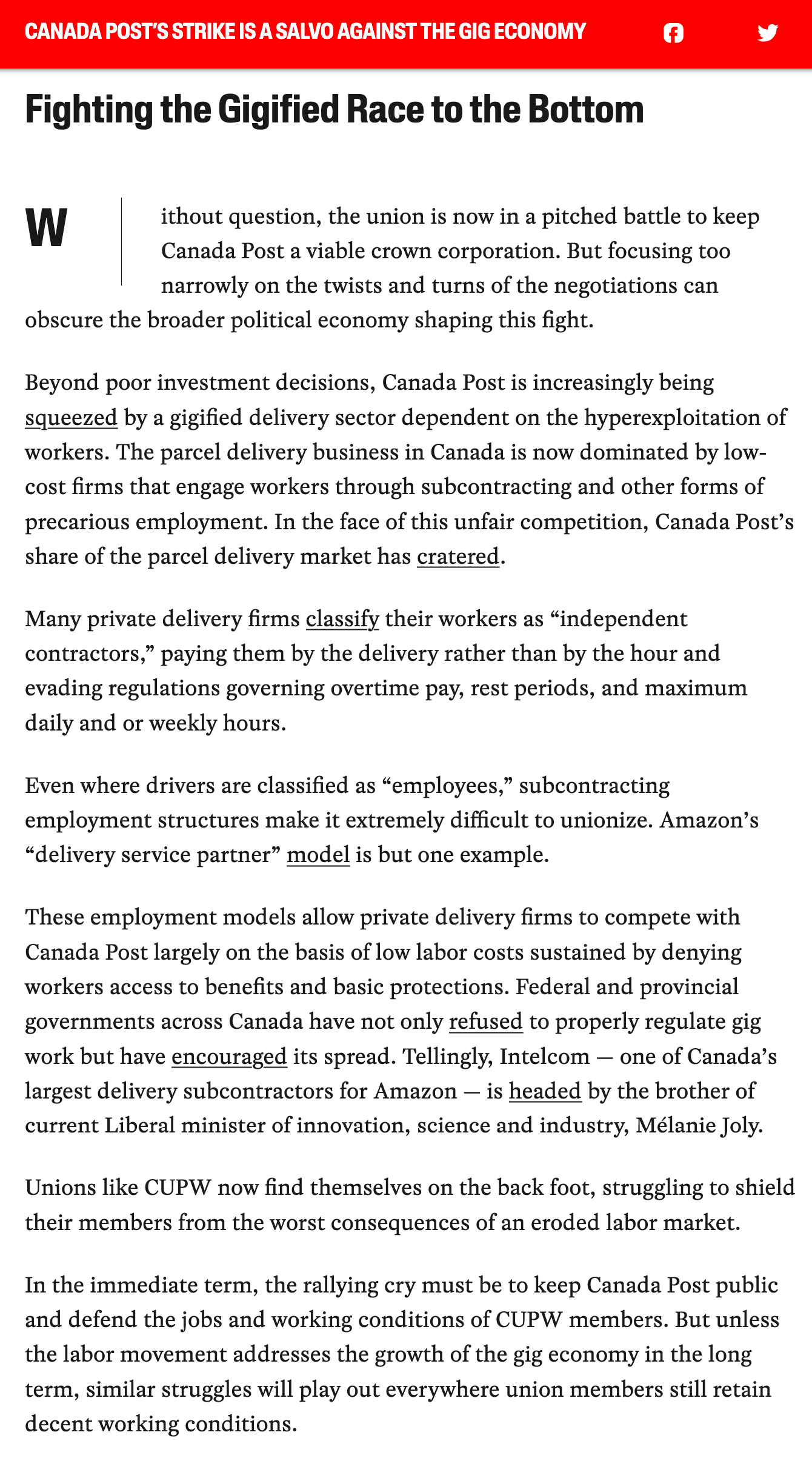 Stand with your posties and the CUPW. They are not just fighting for Canada Post workers. They are fighting for stability and the elimination of exploitive gig work for ALL workers, starting with their industry first. With the big boom in Skip, Uber, etc., so many unwary souls are falling into the trap of delivery work which doesn't pay the bills, which they become trapped in.