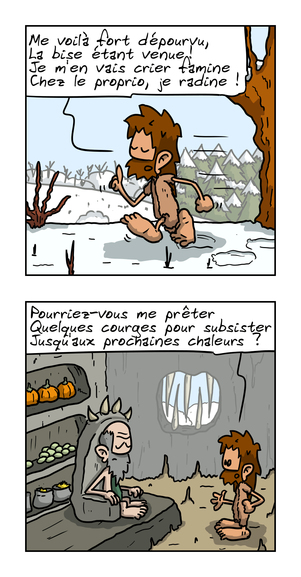 BD en 6 images. IMAGE 1. Jean-Cro déclame, en marchant dans la neige : « Me voilà fort dépourvu / La bise étant venue ! Je m'en vers crier famine / Chez le proprio, je radine ! » IMAGE 2. Jean-Cro, devant le propriétaire qui est assis sur une sorte de trône, avec tout plein de vivres derrière lui : « Pourriez-vous me prêter / Quelques courges pour subsister / Jusqu'aux prochaines chaleurs ? »
