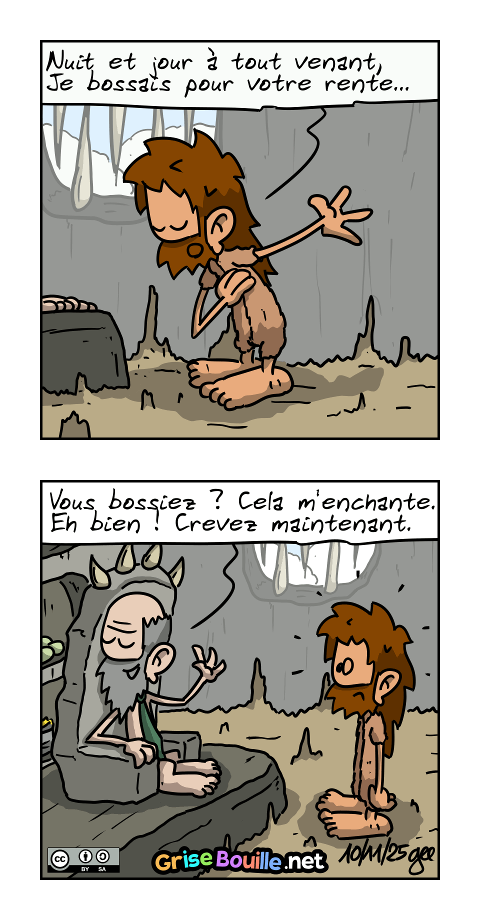 IMAGE 5. Jean-Cro : « Nuit et jour à tout venant / Je bossais pour votre rente. » IMAGE 6. Le propriétaire réplique : « Vous bossiez ? Cela m'enchante. / Eh bien ! crevez maintenant. » Note : BD sous licence CC BY SA (grisebouille.net), dessinée le 10 novembre 2025 par Gee.
