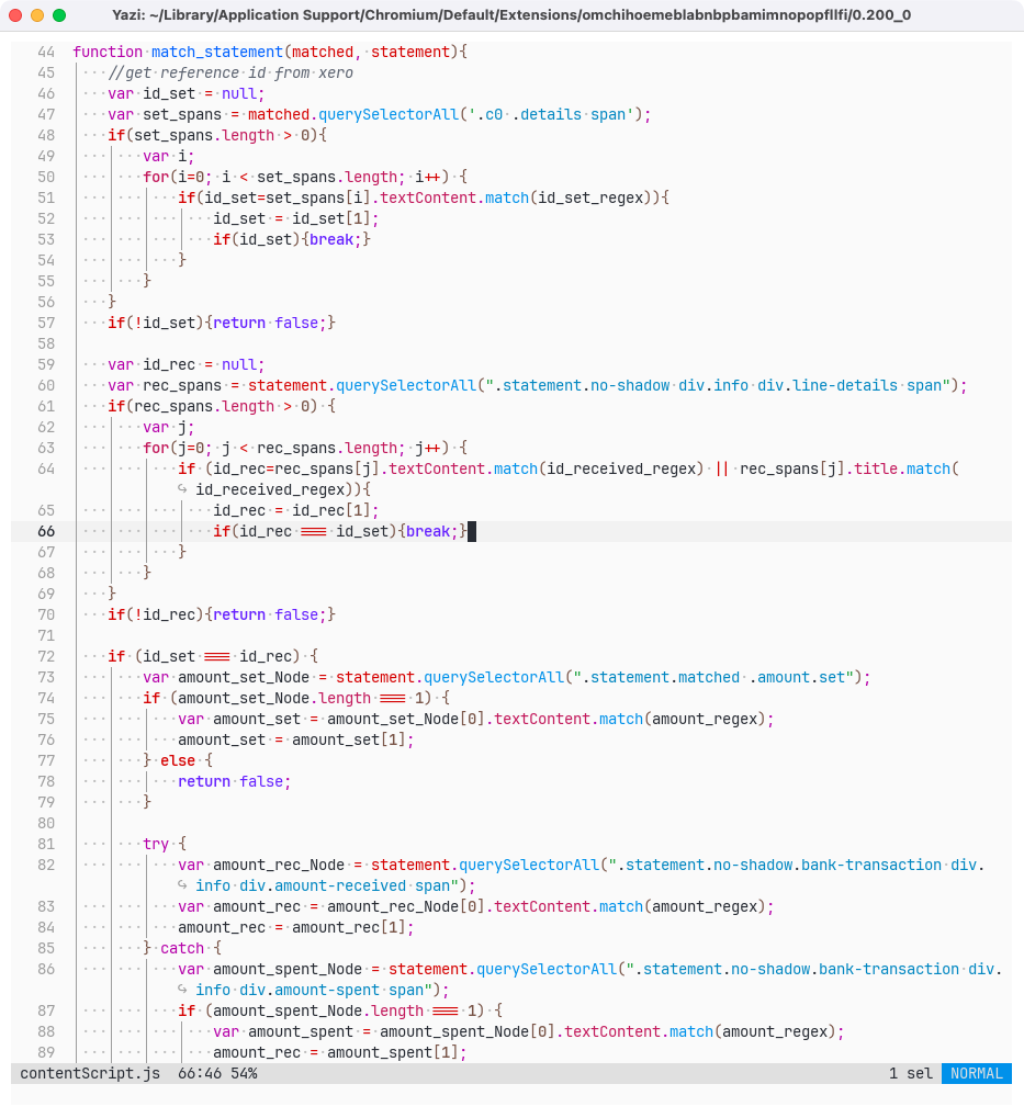 Screenshot detail of code: function match_statement(matched, statement){ //get reference id from xero var id_set = null; var set_spans = matched.querySelectorAll('.c0 .details span'); if(set_spans.length > 0){ var i; for(i=0; i < set_spans.length; i++) { if(id_set=set_spans[i].textContent.match(id_set_regex)){ id_set = id_set[1]; if(id_set){break;} } } } if(!id_set){return false;} var id_rec = null; var rec_spans = statement.querySelectorAll(".statement.no-shadow div.info div.line-details span"); if(rec_spans.length > 0) { …