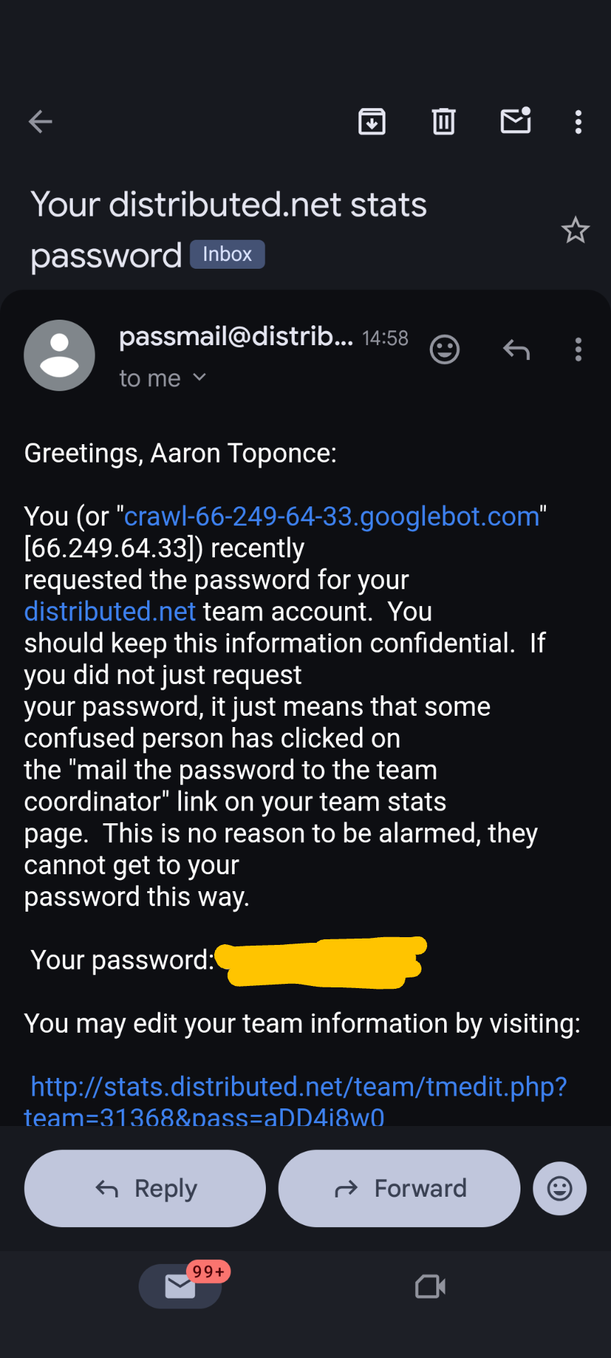 Distributed.net stores #passwords in plain text. I just received the following email.