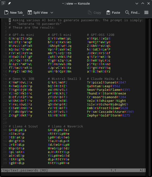 Asking various #AI bots to generate 10 #passwords, then using #Vim syntax highlighting to match different character classes to visually identify patterns.