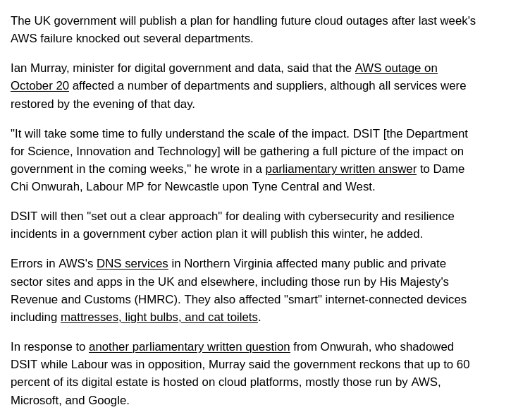 The UK government will publish a plan for handling future cloud outages after last week's AWS failure knocked out several departments. Ian Murray, minister for digital government and data, said that the AWS outage on October 20 affected a number of departments and suppliers, although all services were restored by the evening of that day. "It will take some time to fully understand the scale of the impact. DSIT [the Department for Science, Innovation and Technology] will be gathering a full picture of the impact on government in the coming weeks," he wrote in a parliamentary written answer to Dame Chi Onwurah, Labour MP for Newcastle upon Tyne Central and West DSIT will then "set out a clear approach" for dealing with cybersecurity and resilience incidents in a government cyber action plan it will publish this winter, he added. Errors in AWS's DNS services in Northern Virginia affected many public and private sector sites and apps in the UK and elsewhere, including those run by His Majesty's Revenue and Customs (HMRC). They also affected "smart" internet-connected devices including mattresses, light bulbs, and cat toilets. In response to another parliamentary written question from Onwurah, who shadowed DSIT while Labour was in opposition, Murray said the government reckons that up to 60 percent of its digital estate is hosted on cloud platforms, mostly those run by AWS, Microsoft, and Google.