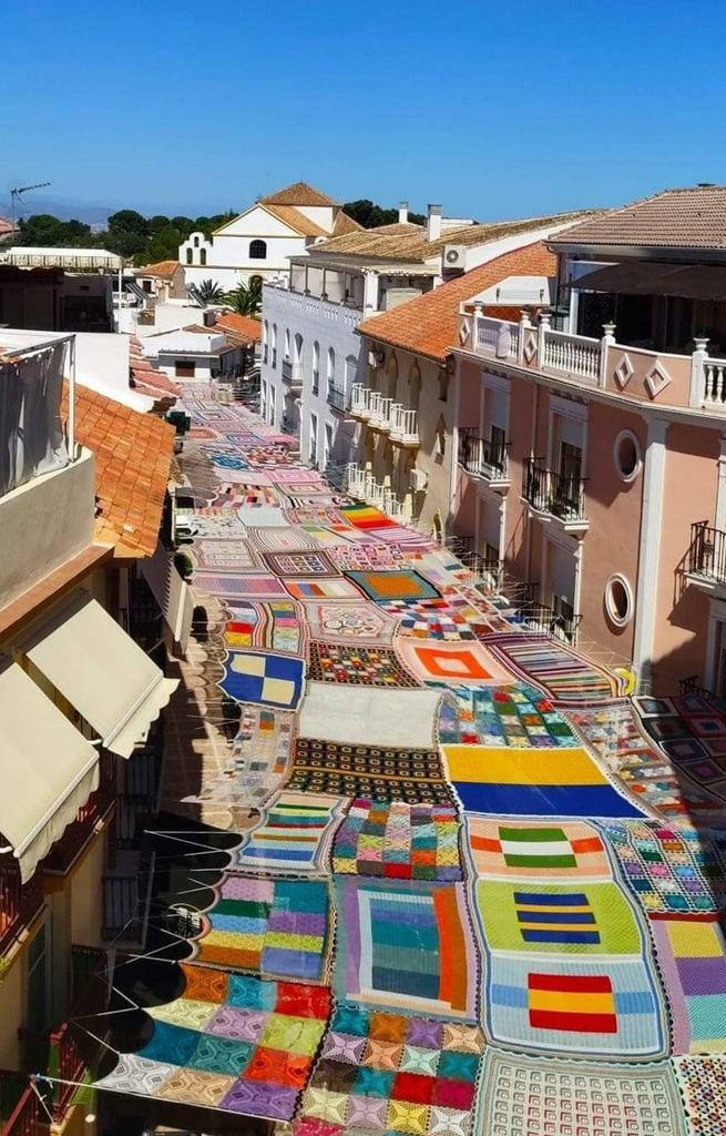 Spanish crochet teacher Eva Pacheco and her students created a street canopy in crochet and knitting, making welcome shade for the community of Alhaurín de la Torre, Malaga #WomensArt 🇪🇸