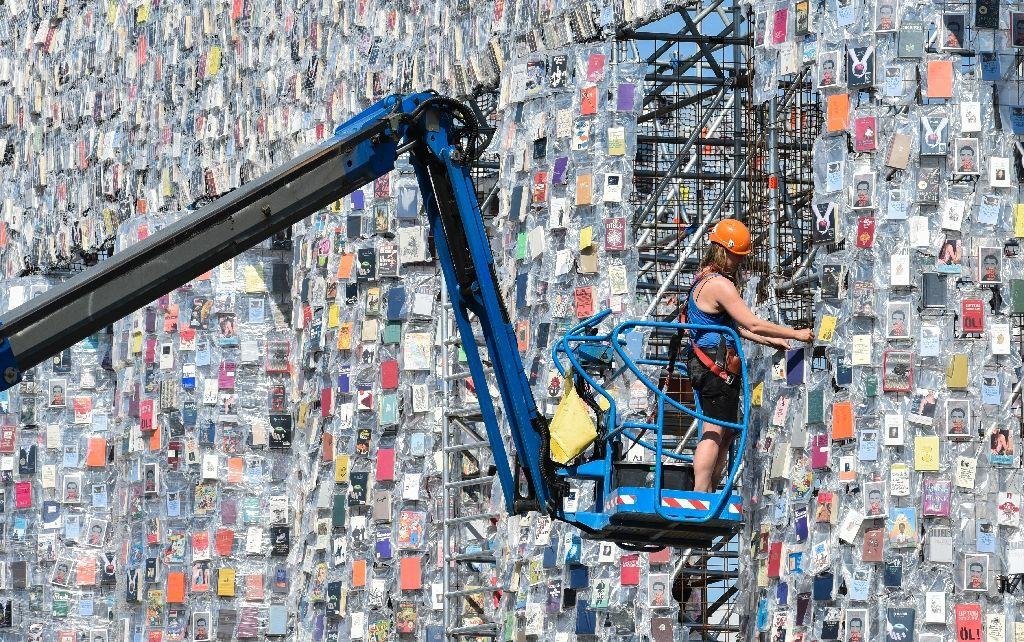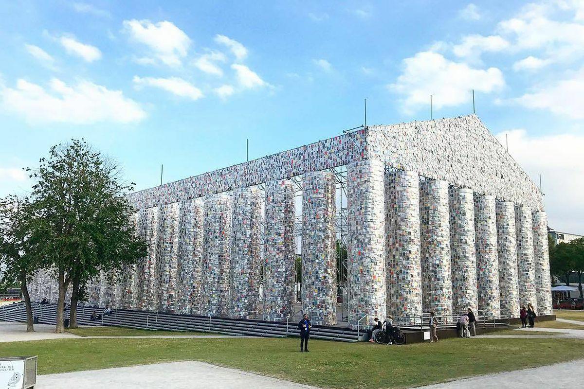Argentine artist Marta Minujín's monumental replica of the Greek Parthenon created with 100,000 copies of banned books, to symbolizes resistance to political repression and tyranny and attacks on free speech #WomensArt